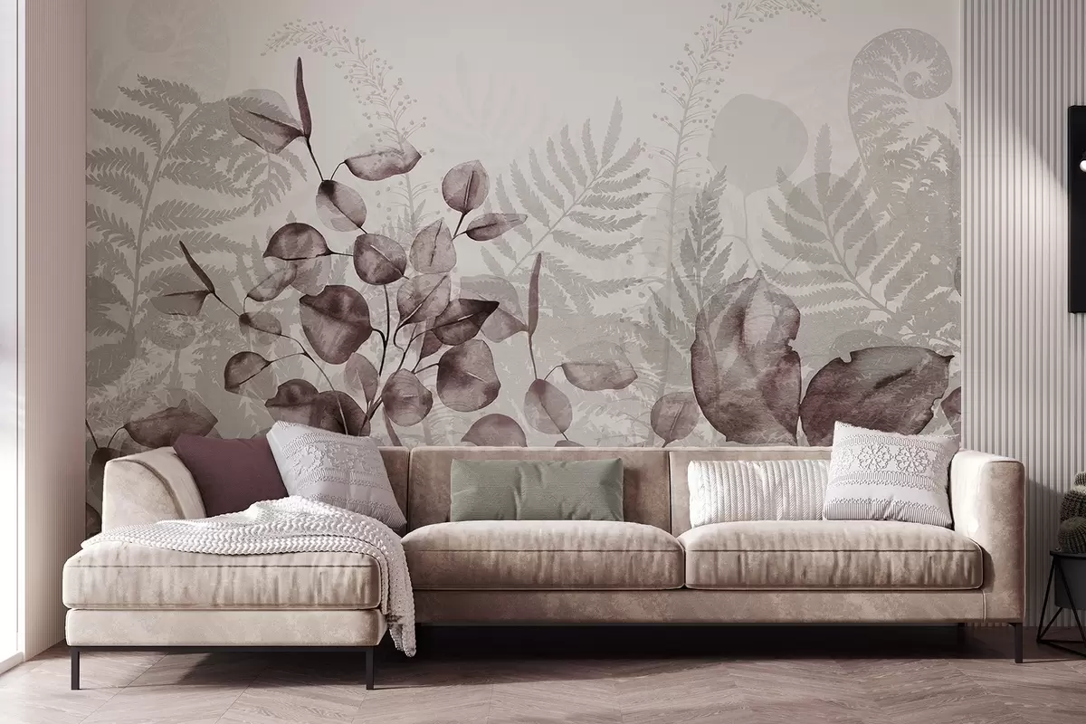 Papel tapiz Hojas de eucalipto y helecho en tonos bordo y gris, efecto acuarela , ilustración botánica Nr. w09197v1
