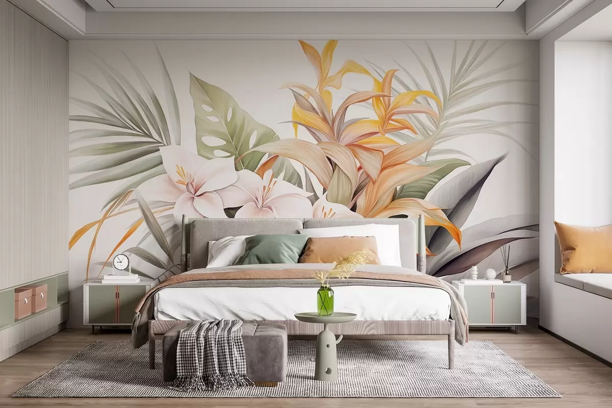 Papel tapiz Ilustración botánica de flores tropicales con hojas de palmera y monstera,colores suaves, estilo acuarela Nr. w09201