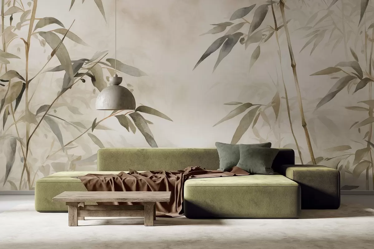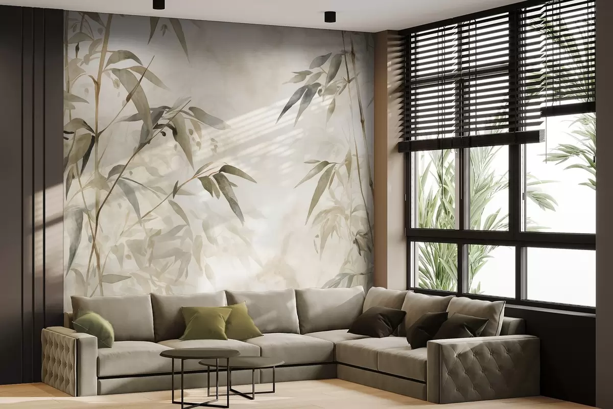Papel tapiz Ramas con textura de bambú y hojas en estilo acuarela, suave paleta de colores neutros, fondo beige claro Nr. w09204