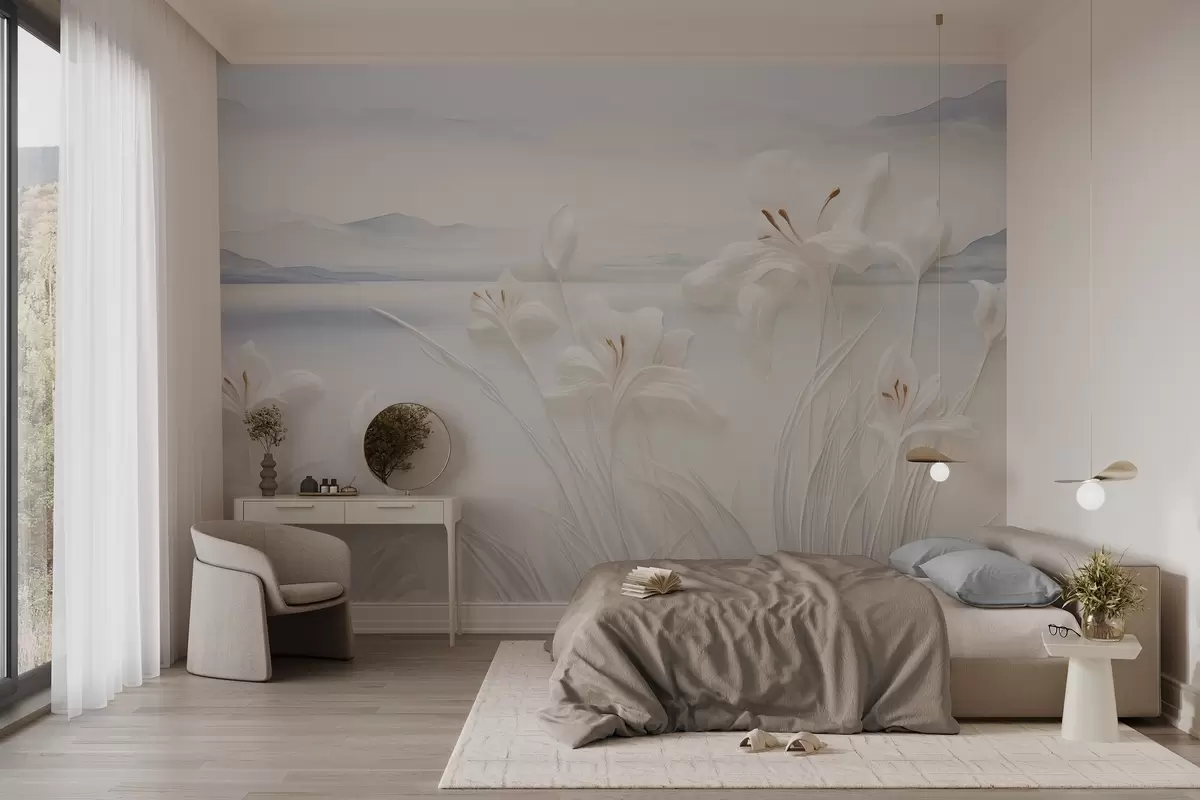Papel tapiz Lirios blancos con largos tallos y hojas, montañas y lago al fondo, composición paisajística minimalista Nr. w09206
