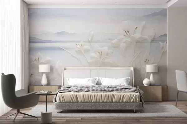 Papel tapiz Lirios blancos con largos tallos y hojas, montañas y lago al fondo, composición paisajística minimalista Nr. w09206