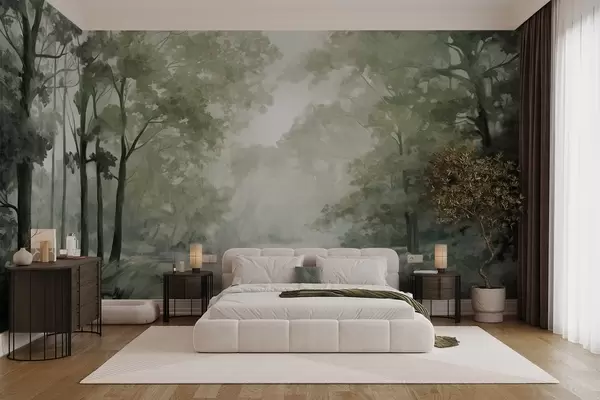 Papel tapiz Paisaje forestal texturizado, árboles con hojas verdes, paleta de colores pastel Nr. w09210v2