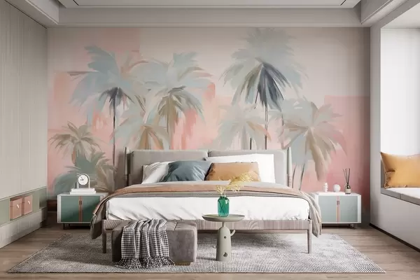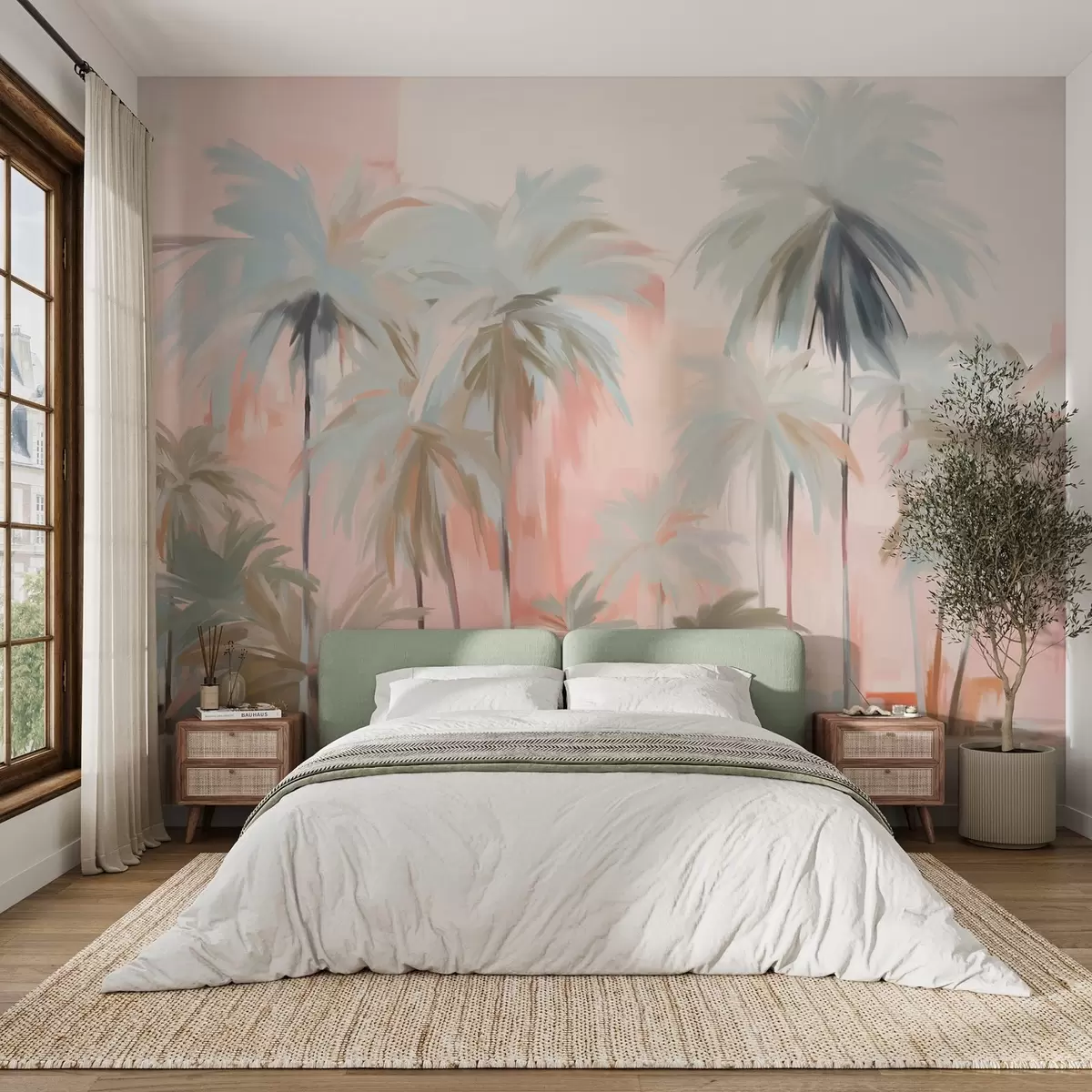 Papel tapiz Palmeras tropicales abstractas minimalistas en tonos pastel, sobre un fondo de suaves tonos rosa y melocotón Nr. w09212