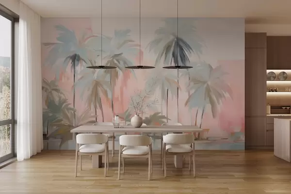 Papel tapiz Palmeras tropicales abstractas minimalistas en tonos pastel, sobre un fondo de suaves tonos rosa y melocotón Nr. w09212