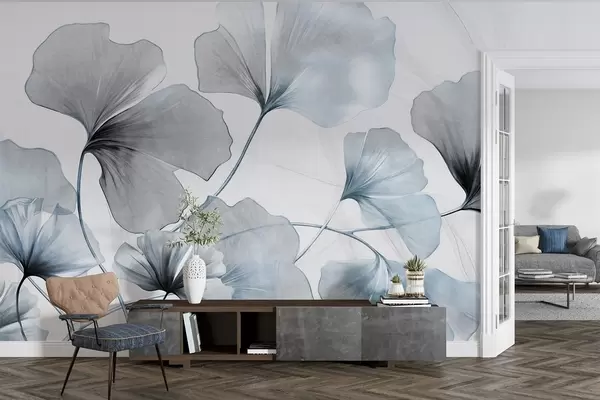 Papel tapiz Hojas de Ginkgo biloba en tonos azules y grises apagados, delicado efecto de acuarela texturizada, fondo claro Nr. w09215v1