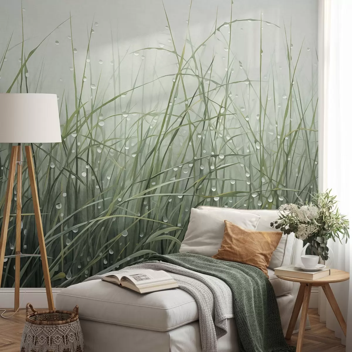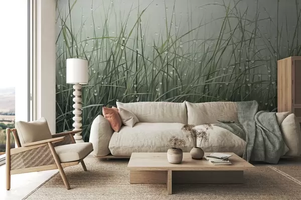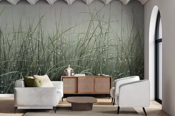 Papel tapiz Hierba con gotas de agua, tonos verdes apagados, luz suave, fondo brumoso, estilo abstracto minimalista texturizado Nr. w09217