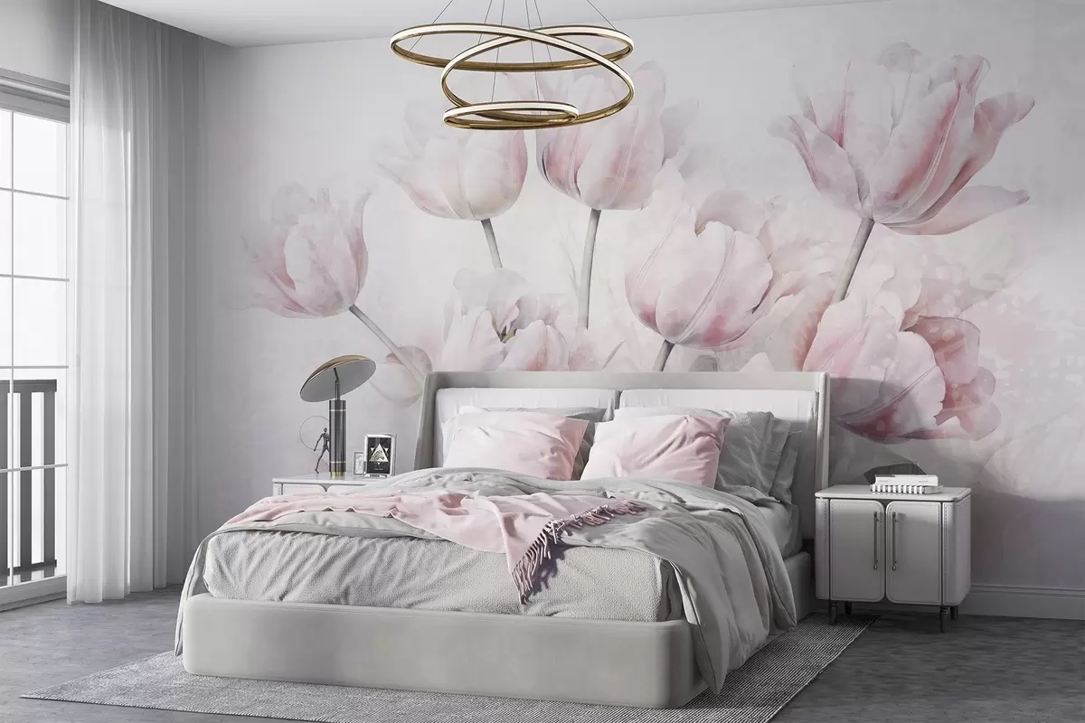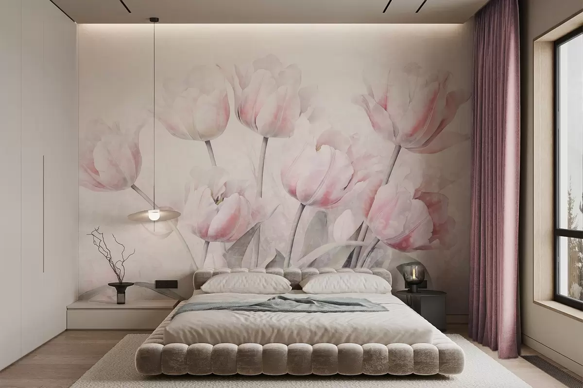 Papel tapiz Tulipanes de textura rosa con hojas verdes, luz suave, estilo acuarela vintage, pinceladas delicadas Nr. w09220