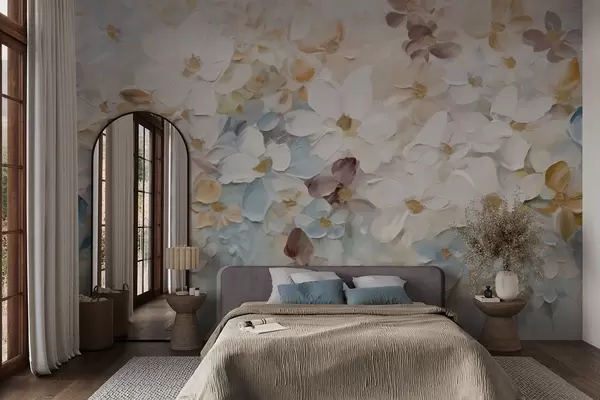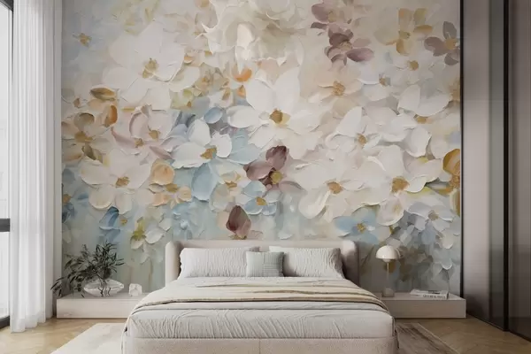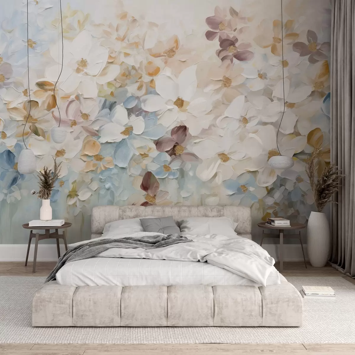 Papel tapiz Pintura al óleo imitación de un jardín de flores con flores blancas, azules y naranjas, pinceladas suaves, colores pastel apagados Nr. w09236v1