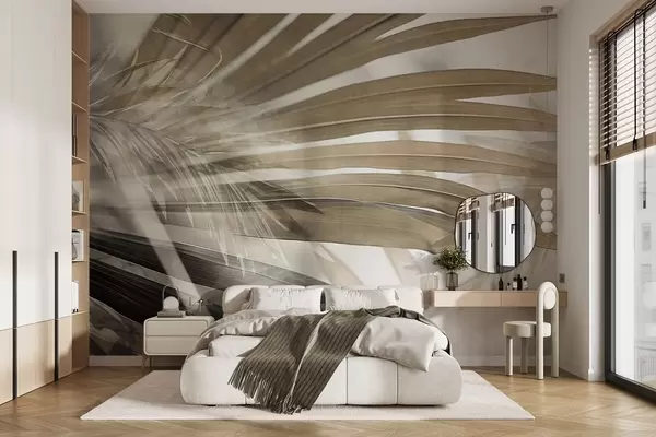 Papel tapiz Hojas de palmera con un tono marrón claro, superpuestas y creando un efecto de capas, sobre un fondo suave y neutro Nr. w09256