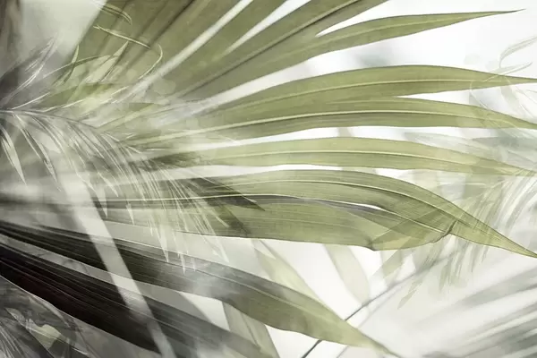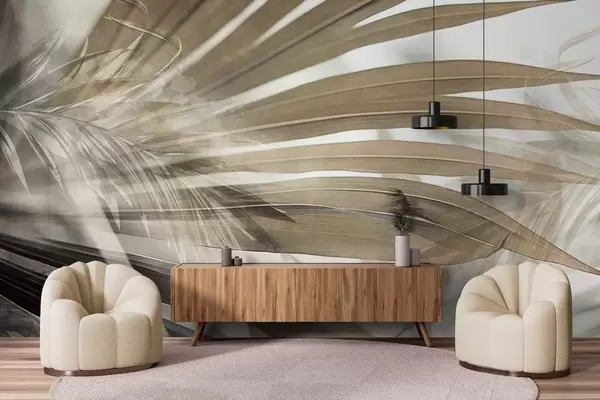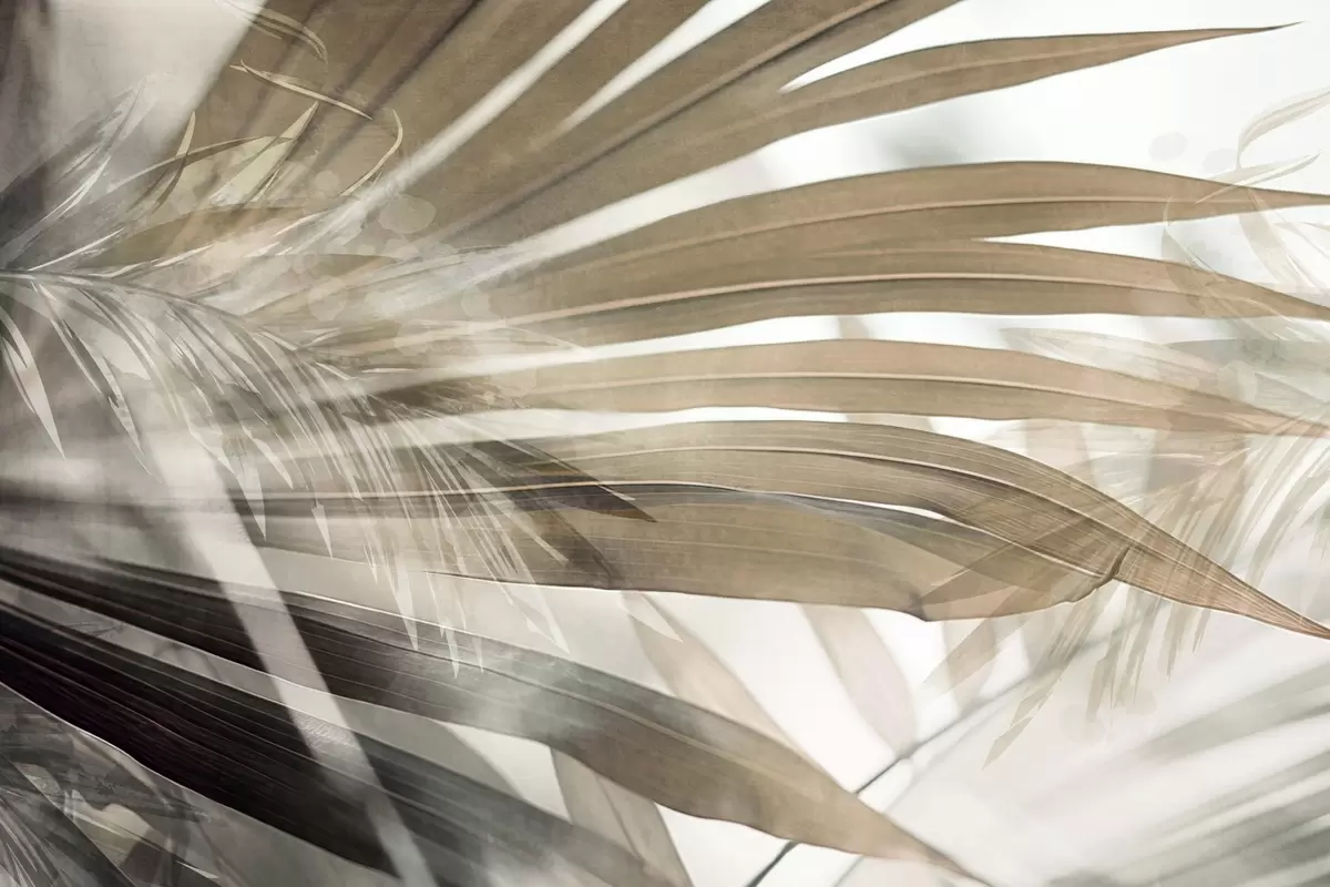 Papel tapiz Hojas de palmera con un tono marrón claro, superpuestas y creando un efecto de capas, sobre un fondo suave y neutro Nr. w09256