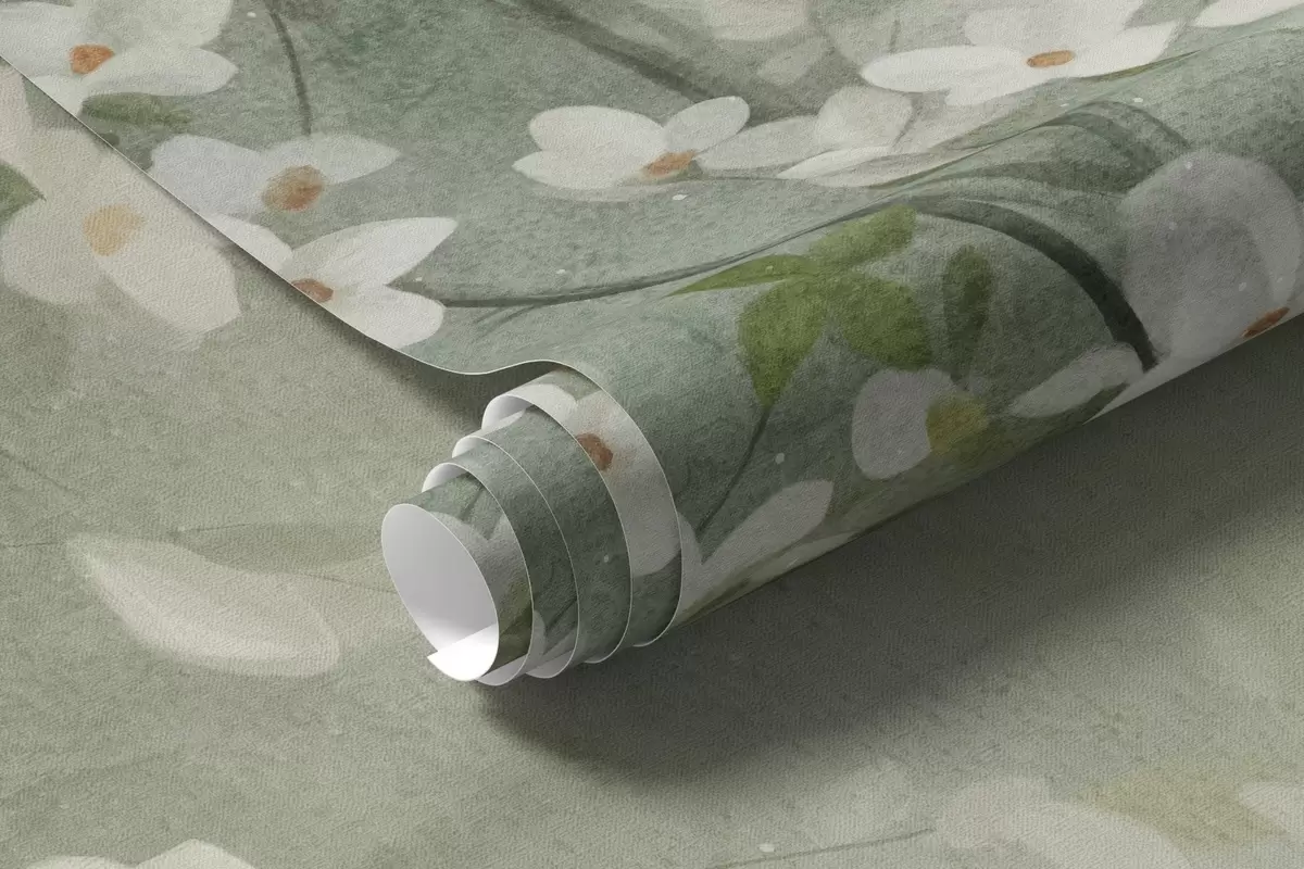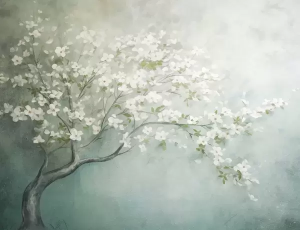 Papel tapiz Un árbol en flor con flores blancas en plena floración, sobre un fondo granulado de textura ruidosa de azules y verdes apagados Nr. w09261