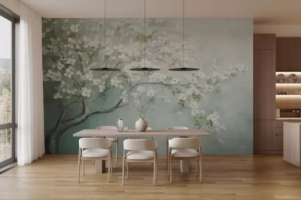 Papel tapiz Un árbol en flor con flores blancas en plena floración, sobre un fondo granulado de textura ruidosa de azules y verdes apagados Nr. w09261