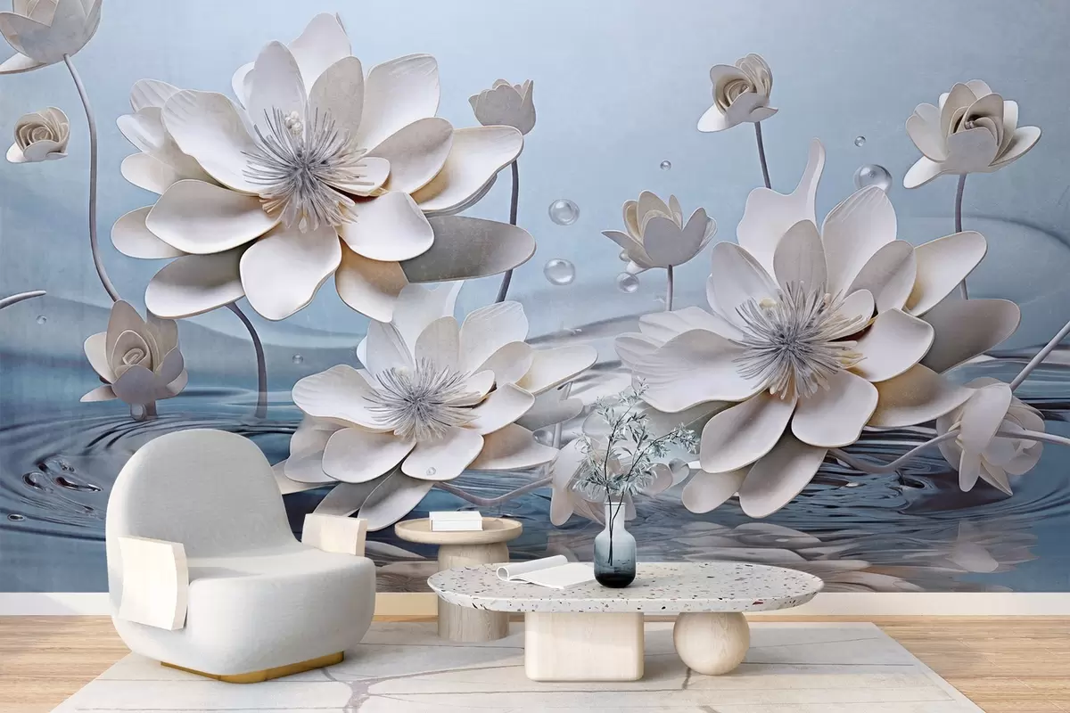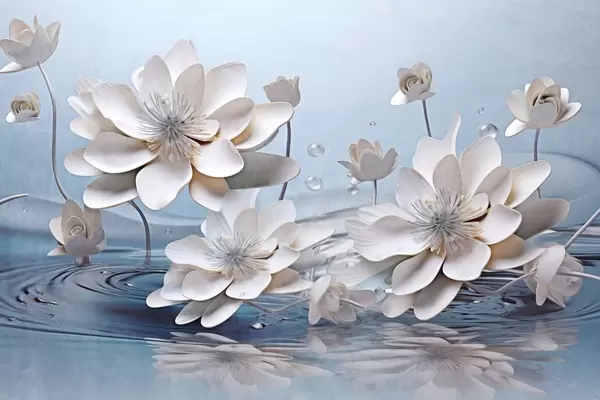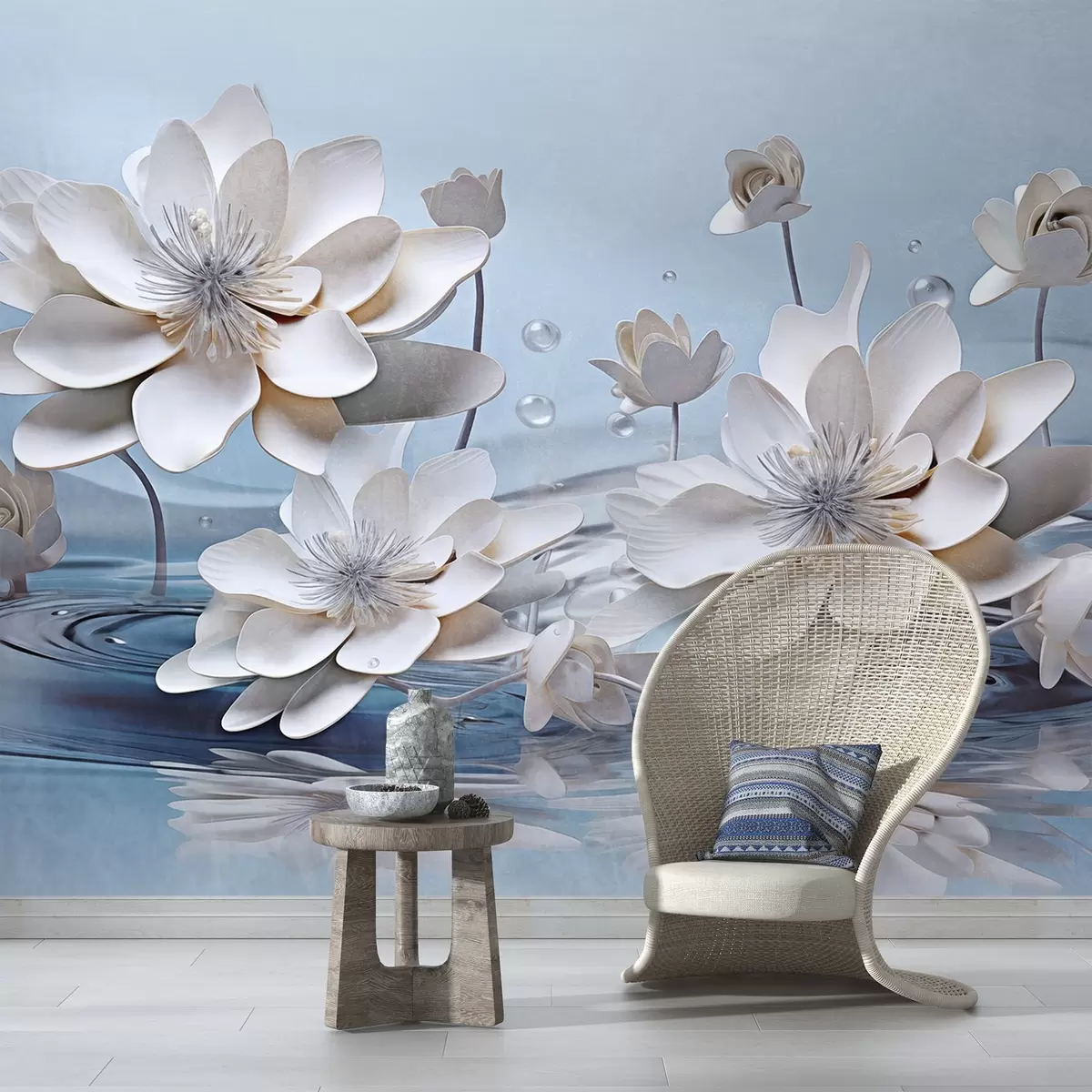 Papel tapiz Flores blancas texturizadas con gotas de agua, reflejos en la superficie del agua, fondo azul claro, diseño elegante Nr. w09262