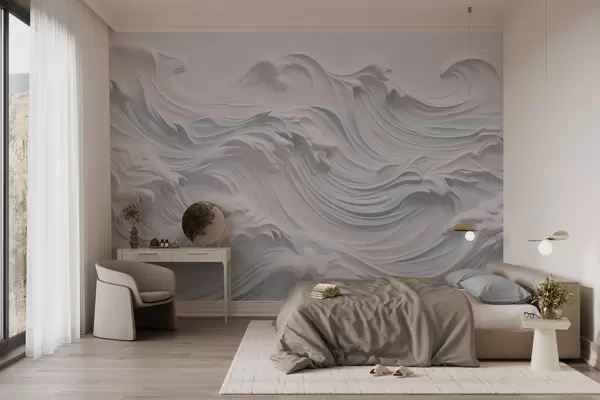 Papel tapiz Olas oceánicas abstractas de color blanco y azul claro con textura y espuma, que fluyen de izquierda a derecha, impresión dinámica y con textura Nr. w09266