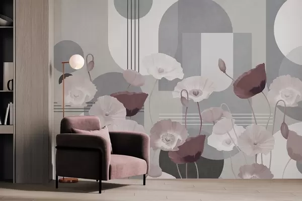 Papel tapiz Amapolas en colores blanco y gris con formas geométricas en el fondo, círculos y arcos, estilo minimalista, colores suaves Nr. w09289v1