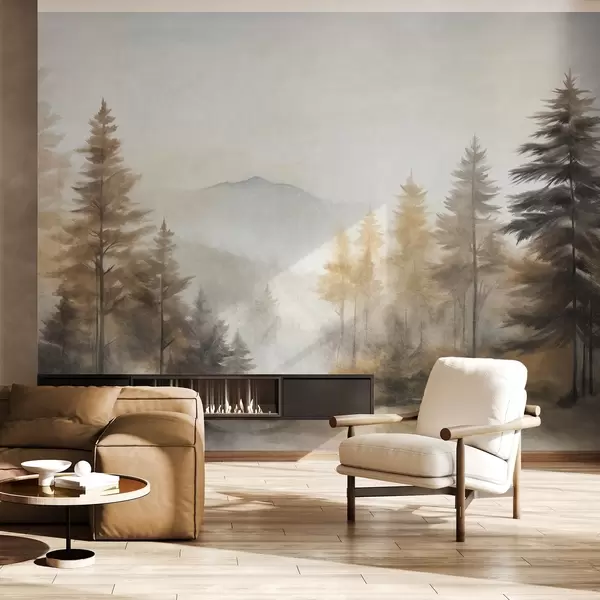 Papel tapiz Bosque otoñal texturizado con altos pinos y montañas al fondo, los colores son apagados y terrosos estilo pintura Nr. w09290