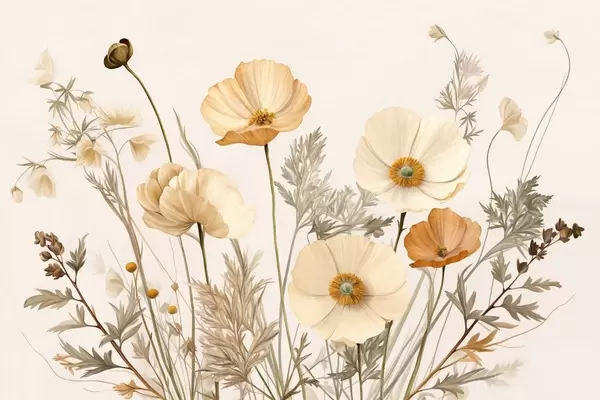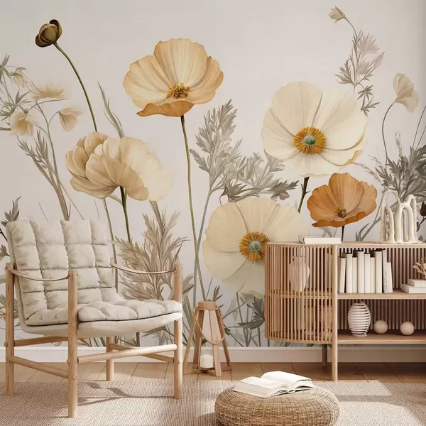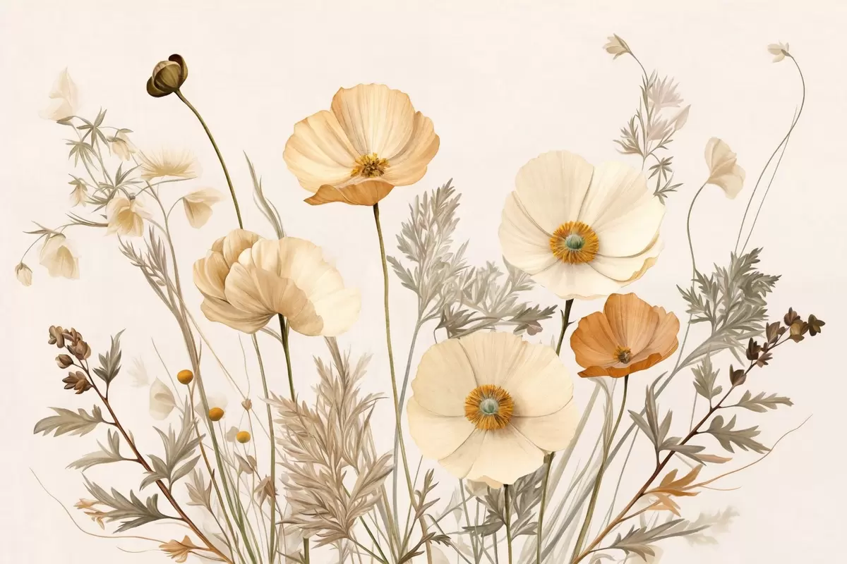 murales de pared Amapolas naranjas y blancas de textura vintage con tallos y hojas finas, fondo beige claro, estilo acuarela w09293
