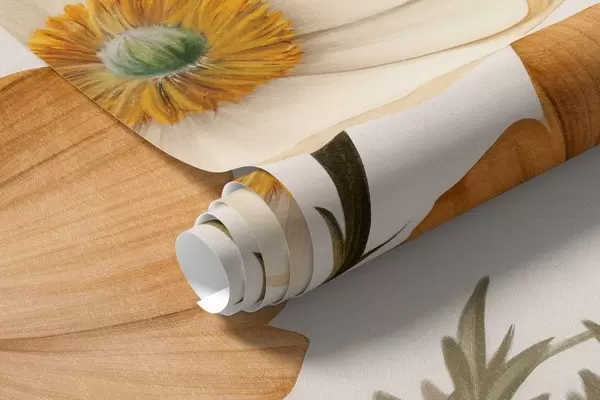 Papel tapiz Amapolas naranjas y blancas de textura vintage con tallos y hojas finas, fondo beige claro, estilo acuarela Nr. w09293