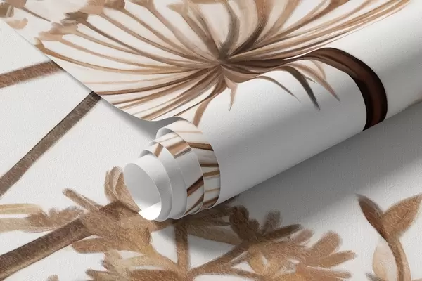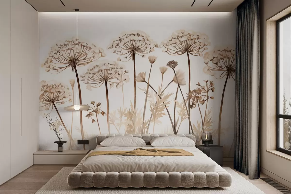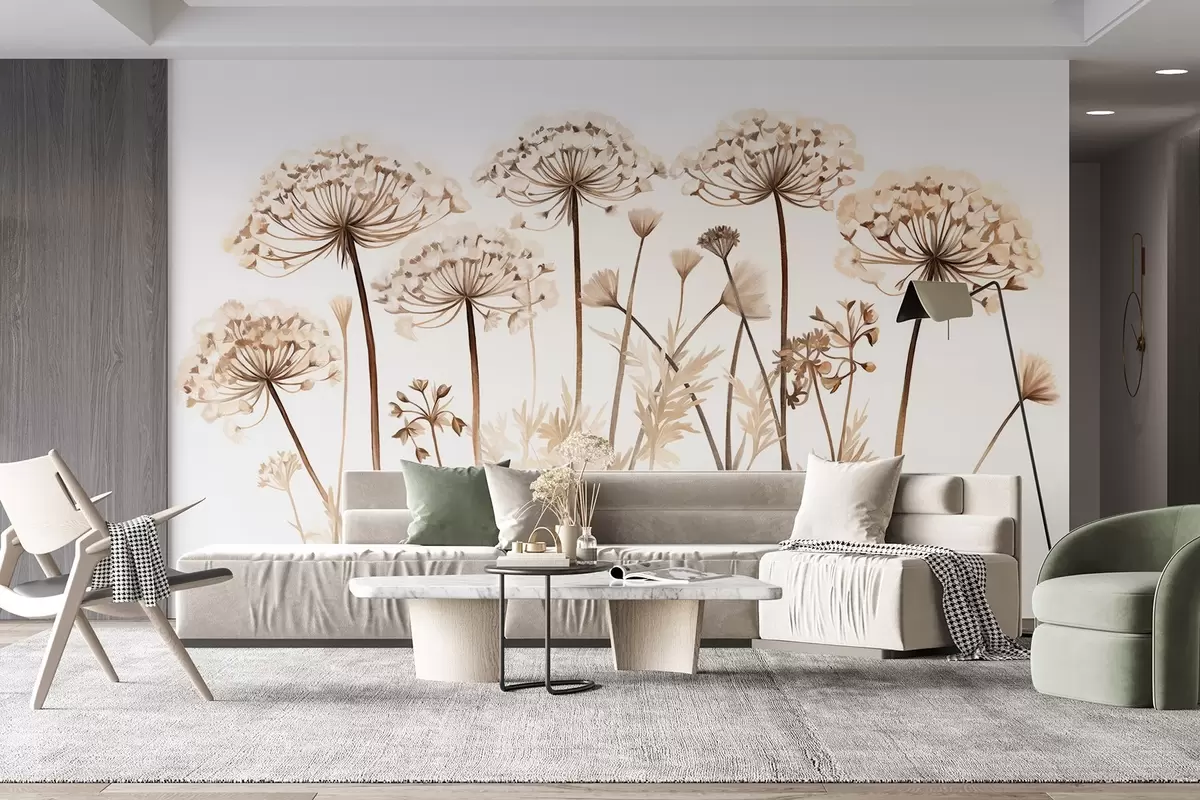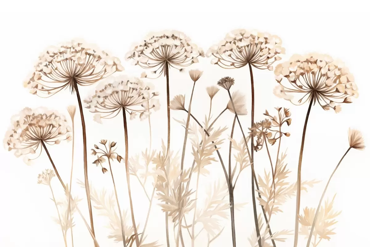 Papel tapiz Flores de Queen Anne's Lace en un campo, imitación de pintura texturizada, paleta de colores marrón, beige y blanco, ilustración botánica Nr. w09294