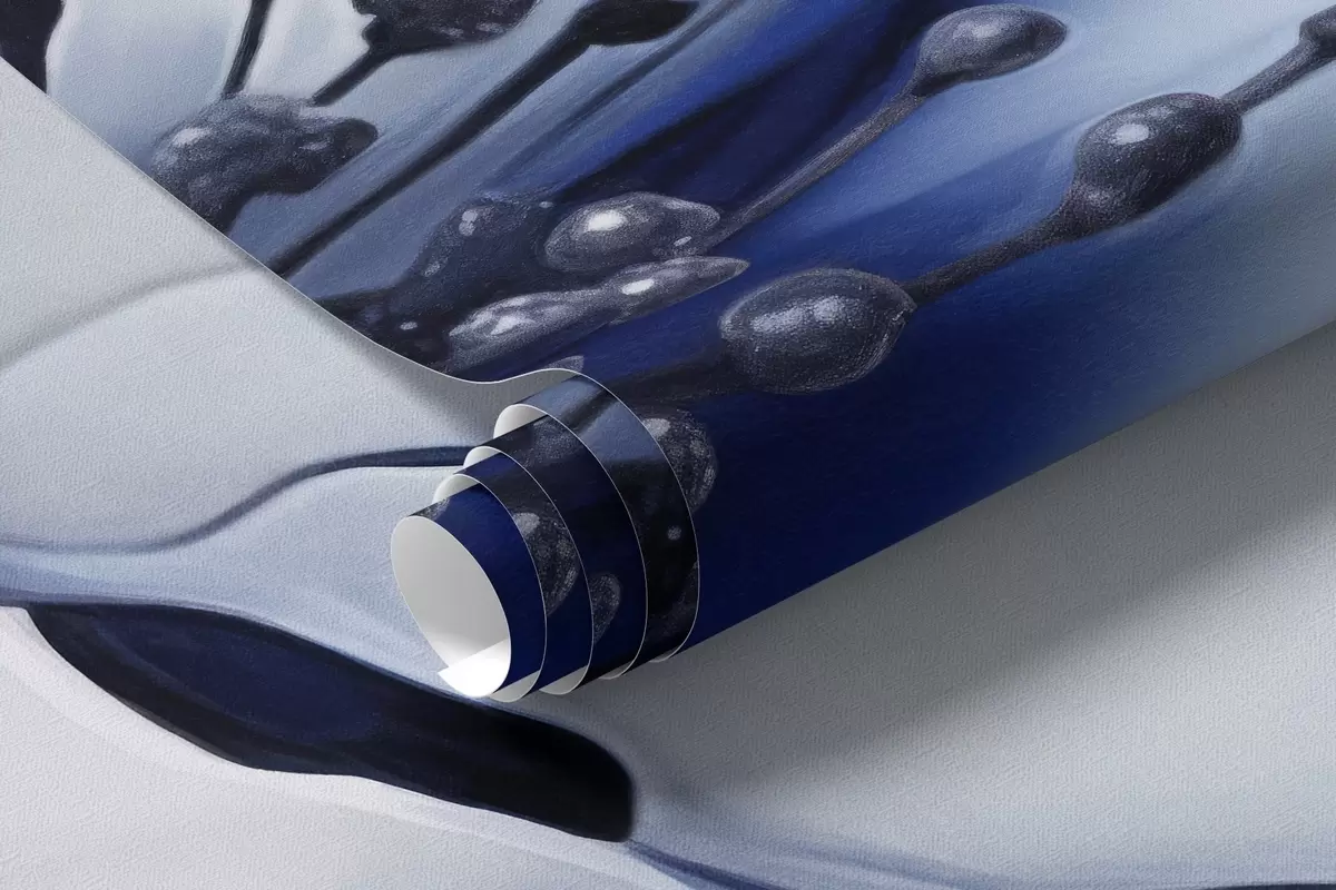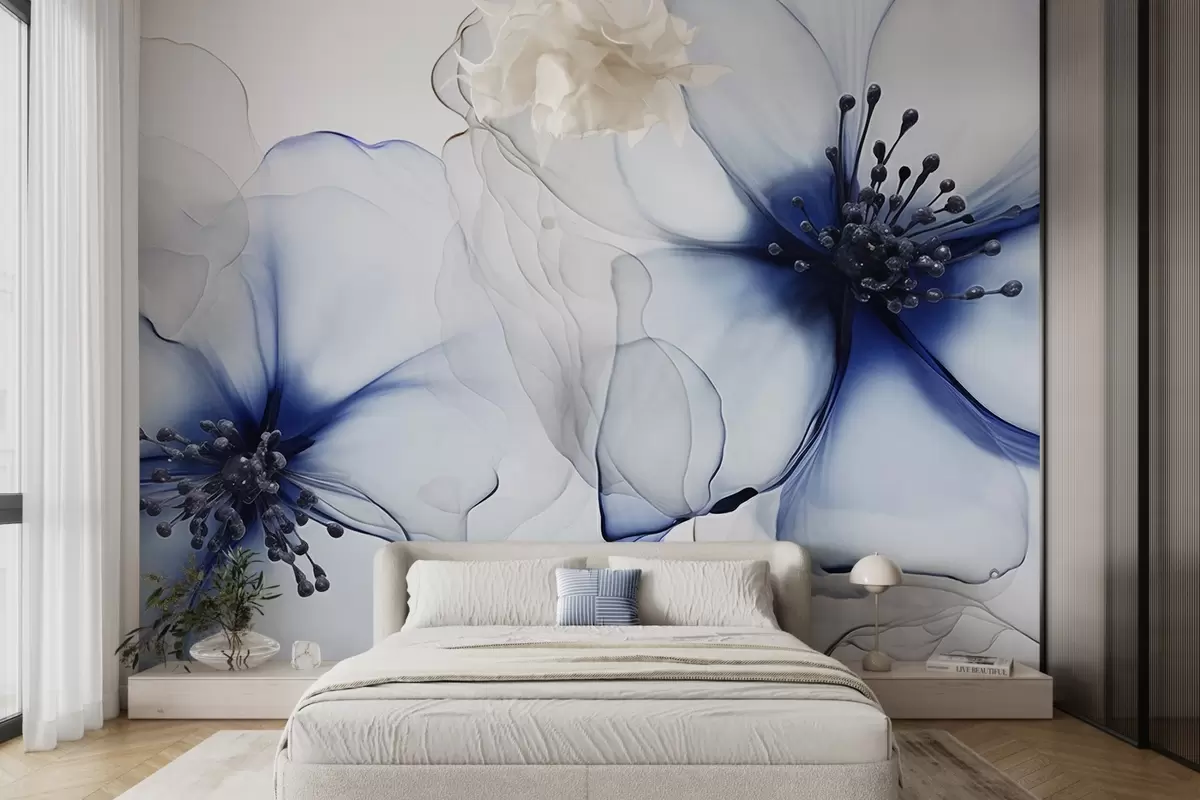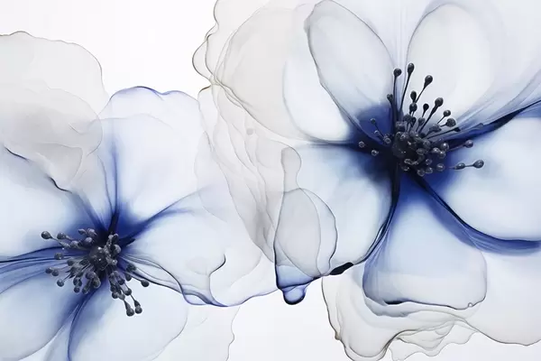 Papel tapiz Dos flores azules de textura translúcida con estambres visibles, delicados pétalos superpuestos y una suave textura fluida Nr. w09295v1