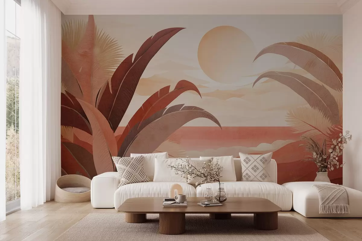 Papel tapiz Paisaje abstracto de textura tropical con hojas de palmera y un gran sol en el cielo, paleta de colores cálidos, estilo minimalista, estilizado Nr. w09296