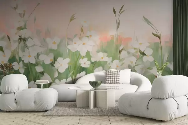 Papel tapiz Campo abstracto de flores silvestres con tallos y hojas verdes, sobre un cielo texturizado de color rosa pálido y blanco. Nr. w09297