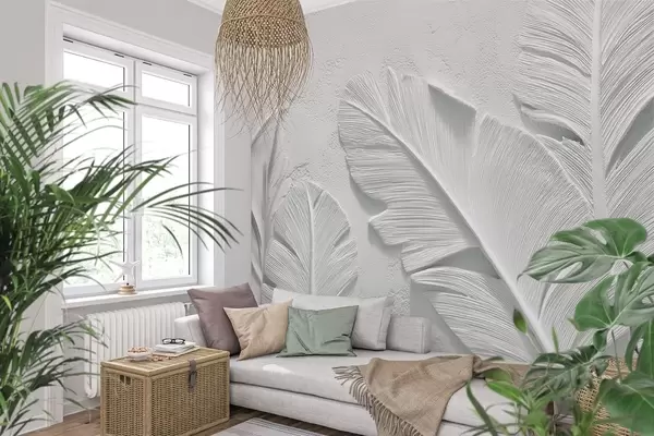 Papel tapiz Hojas grises texturizadas sobre un fondo con relieve de yeso falso Nr. w09307