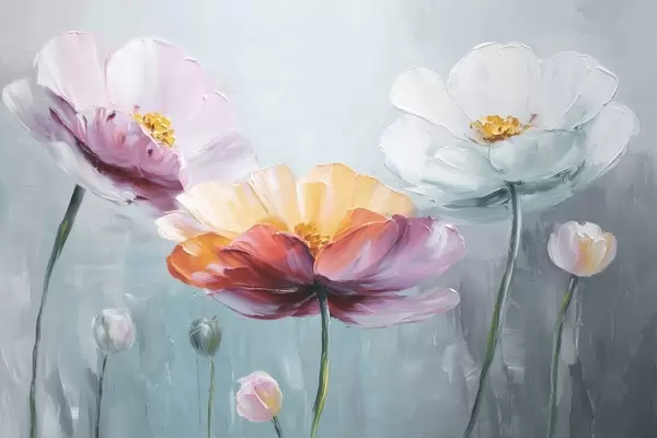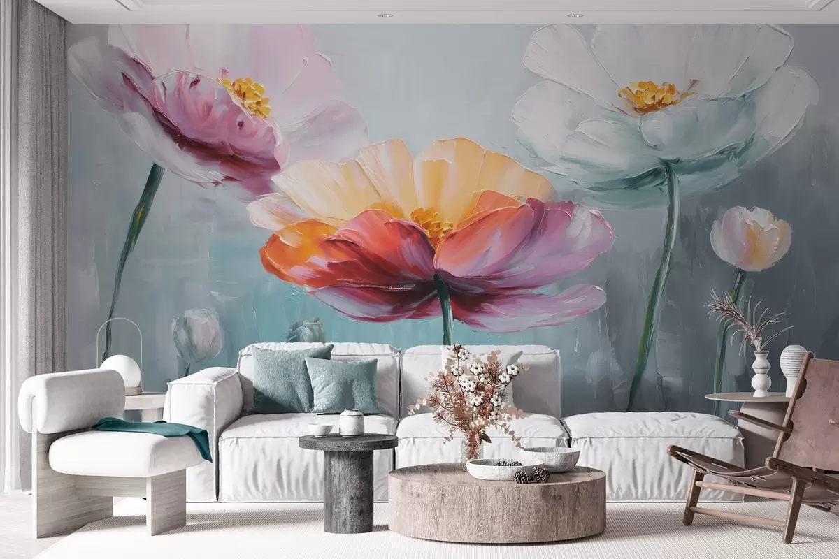 Papel tapiz Flores brillantes en técnica de pintura al óleo sobre fondo azul Nr. w09310