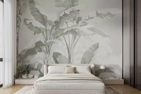 Papel tapiz Hojas de plátano tropical en suaves tonos verdes Nr. w09311v1