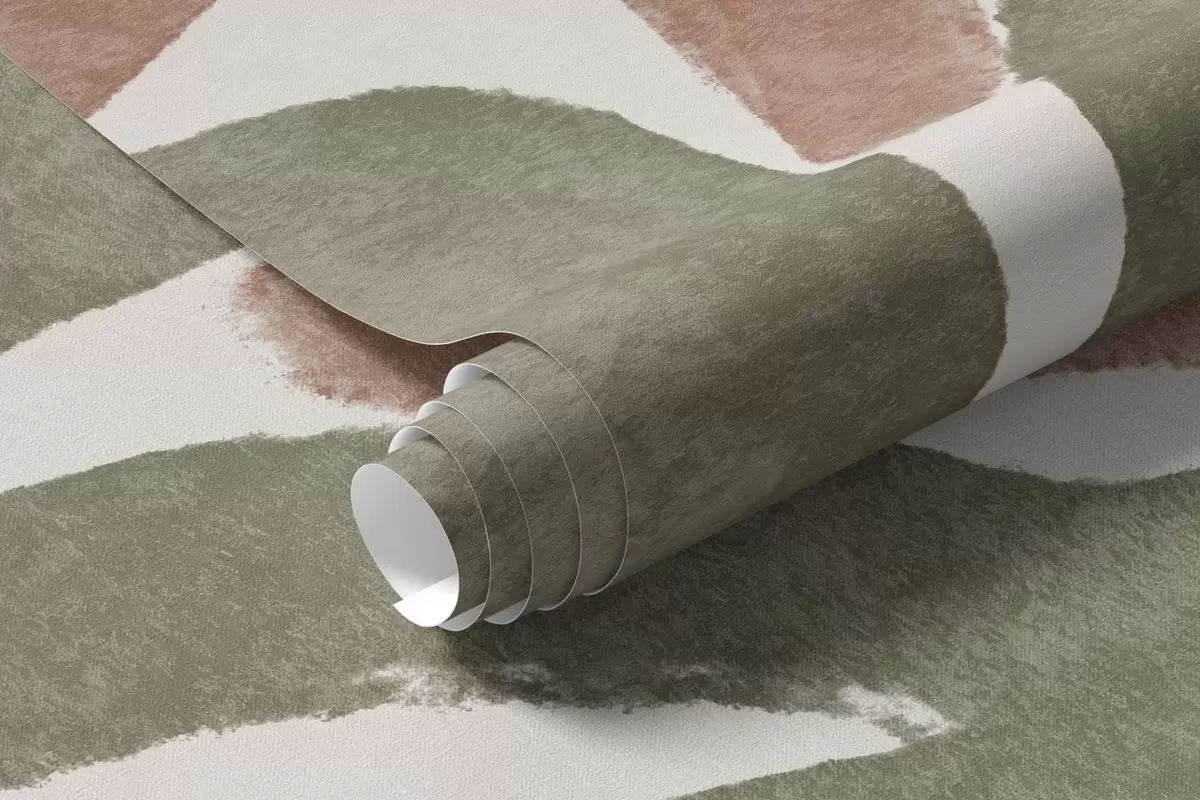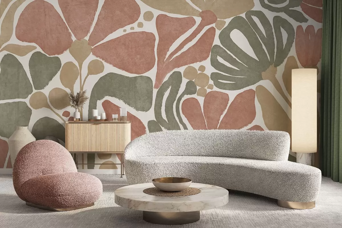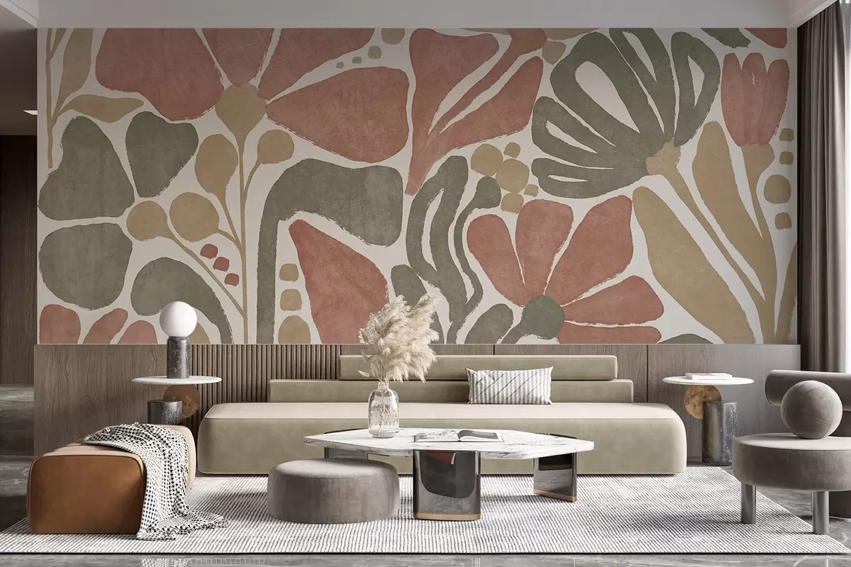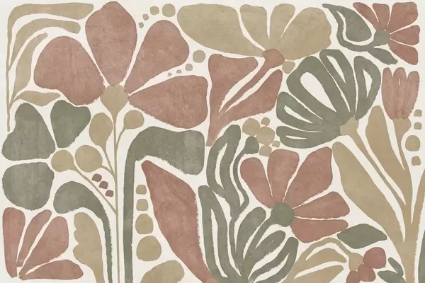 Papel tapiz Flores abstractas en tonos rojos, verdes y beige, con un fondo claro, en un diseño plano, estilizado, moderno y minimalista Nr. w09315