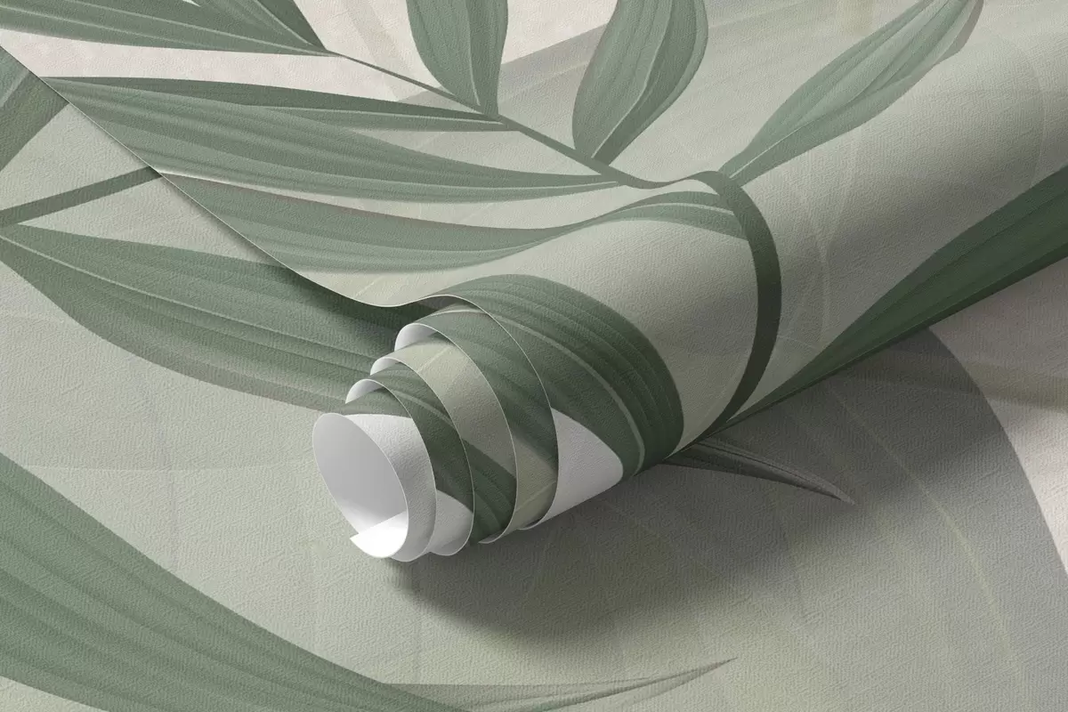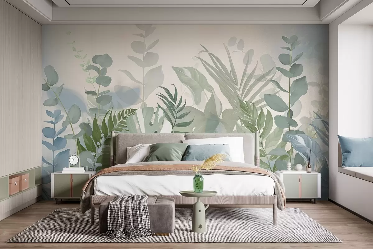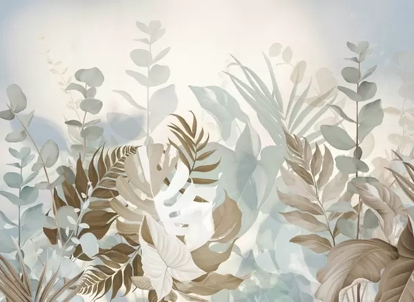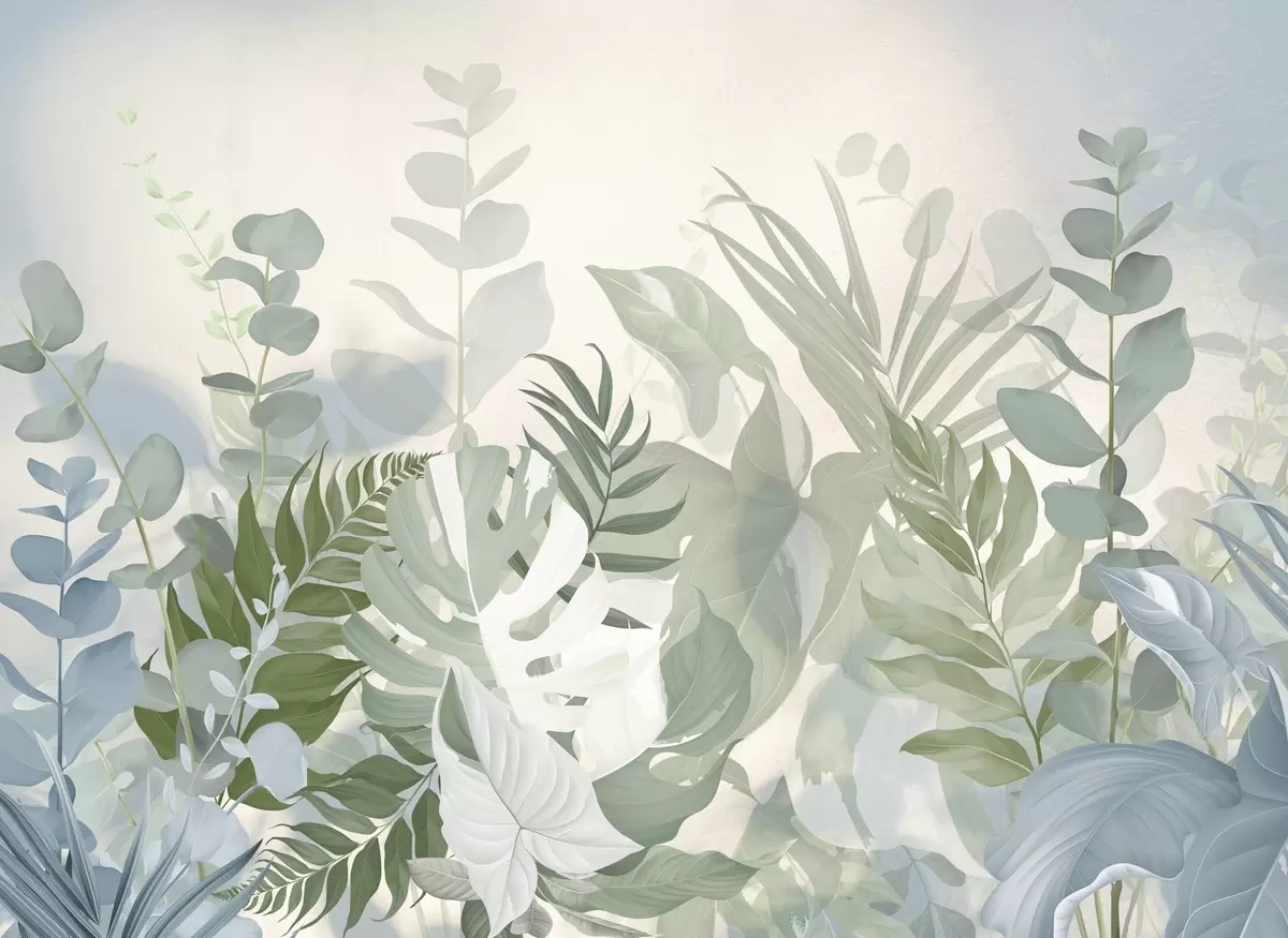 Papel tapiz Plantas verde pastel helechos, monstera y eucalipto, fondo de textura ligera, iluminación suave, tranquilo , ilustración botánica Nr. w09316