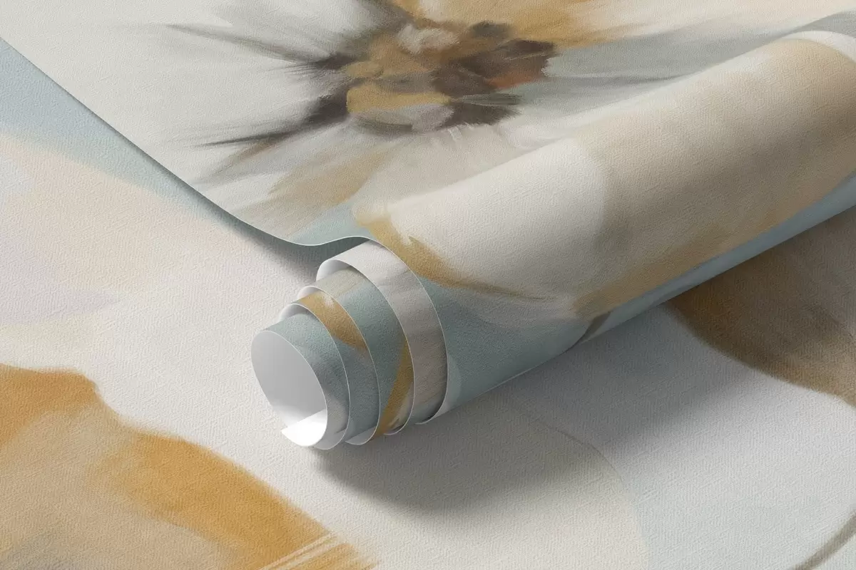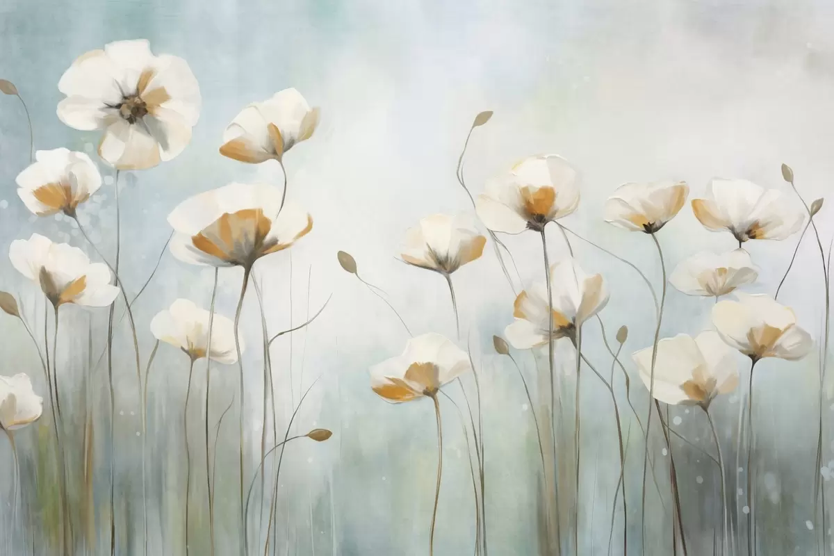 Papel tapiz Amapolas blancas texturizadas sobre largos tallos, fondo azul claro y verde, suaves pinceladas, delicado arreglo floral de campo Nr. w09317