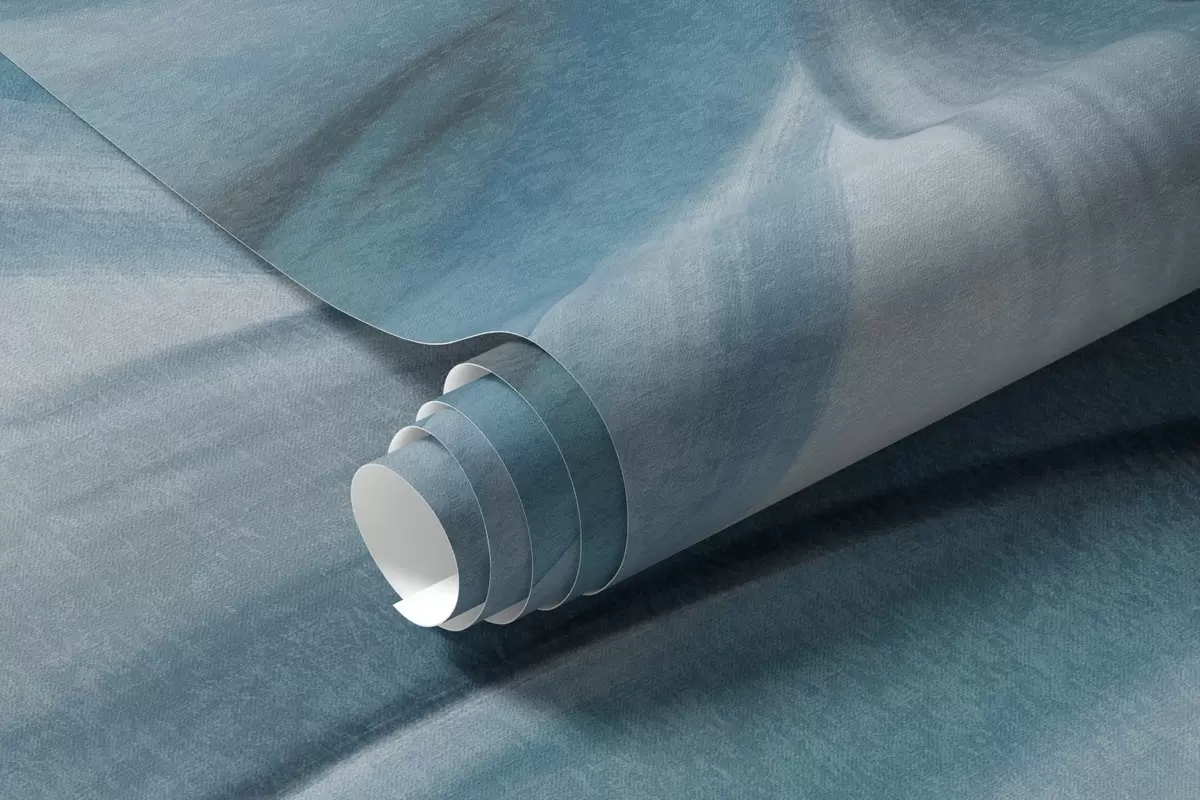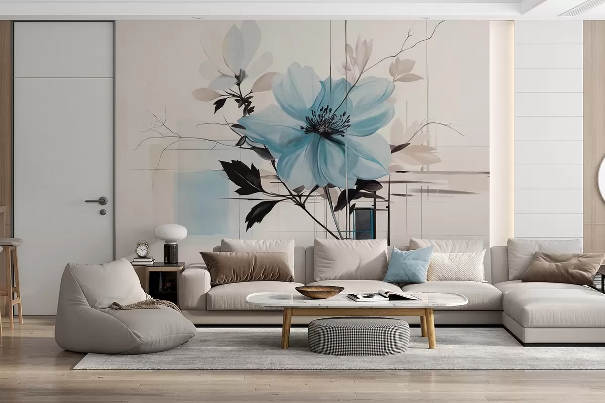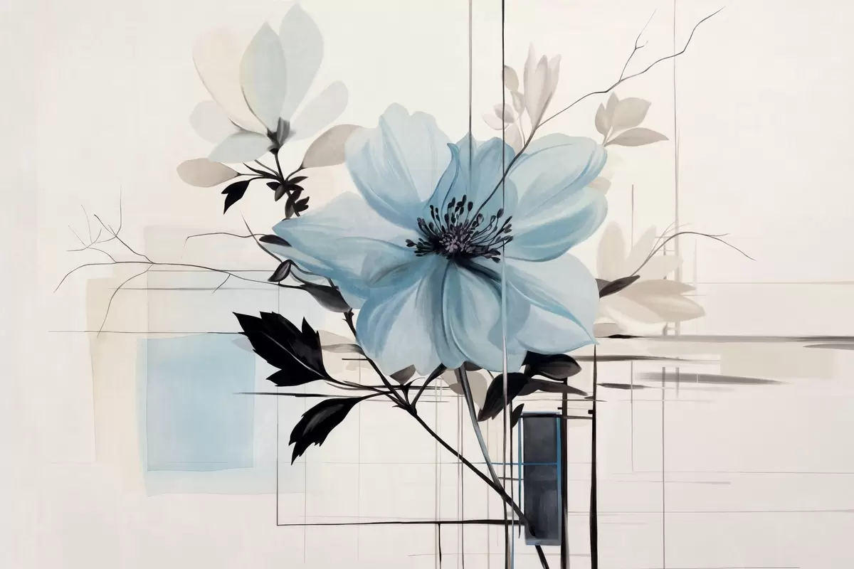 Papel tapiz Flor abstracta azul texturizada con hojas y ramas oscuras, formas geométricas minimalistas y líneas en colores apagados Nr. w09332