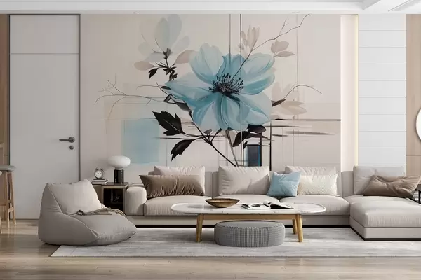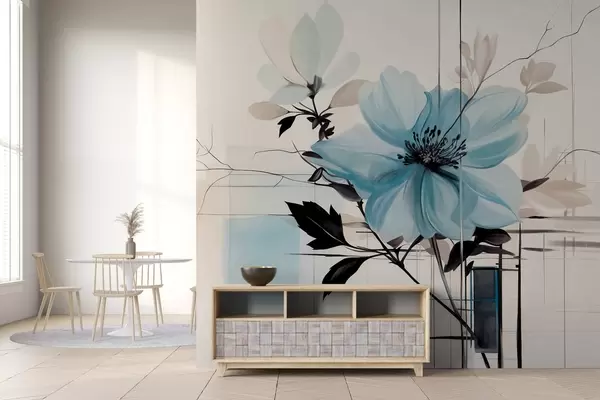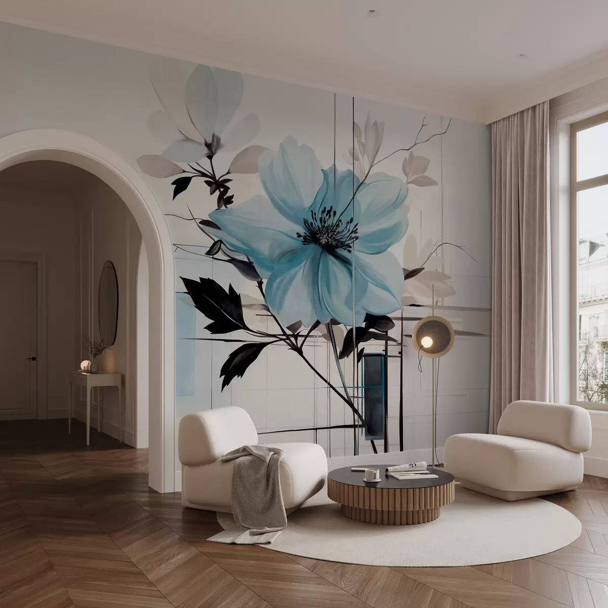 murales de pared Flor abstracta azul texturizada con hojas y ramas oscuras, formas geométricas minimalistas y líneas en colores apagados w09332