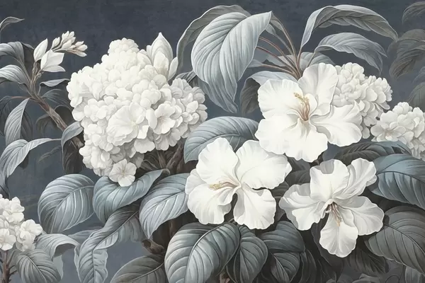 Papel tapiz Flores tropicales blancas con delicados pétalos y hojas en un fondo azul oscuro, estilo vintage texturizado, ilustración botánica Nr. w09334