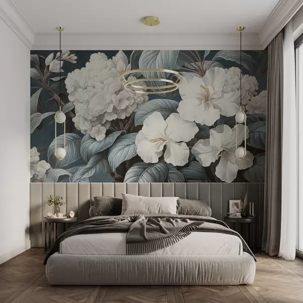 Papel tapiz Flores tropicales blancas con delicados pétalos y hojas en un fondo azul oscuro, estilo vintage texturizado, ilustración botánica Nr. w09334