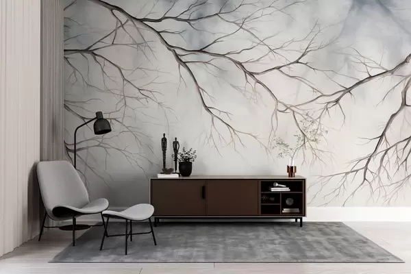 murales de pared Ramas de árbol con un efecto de textura de acuarela, detalles intrincados, paleta de colores suaves, sobre un fondo claro w09337