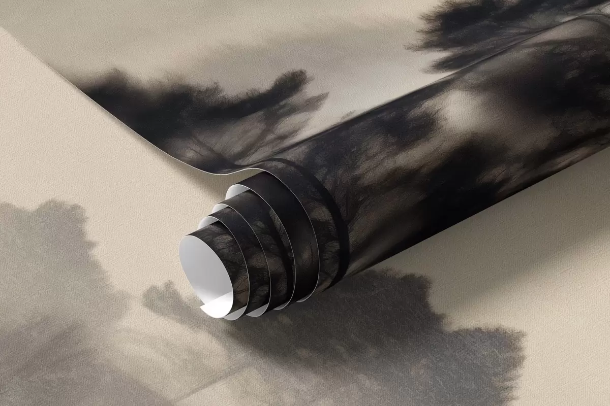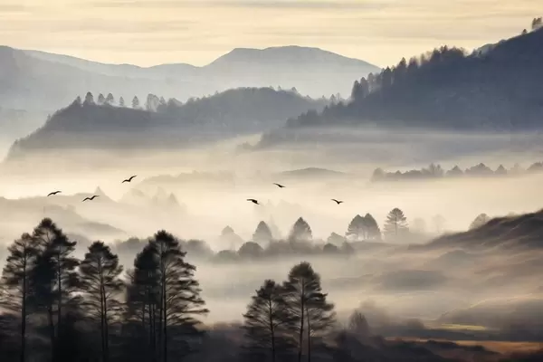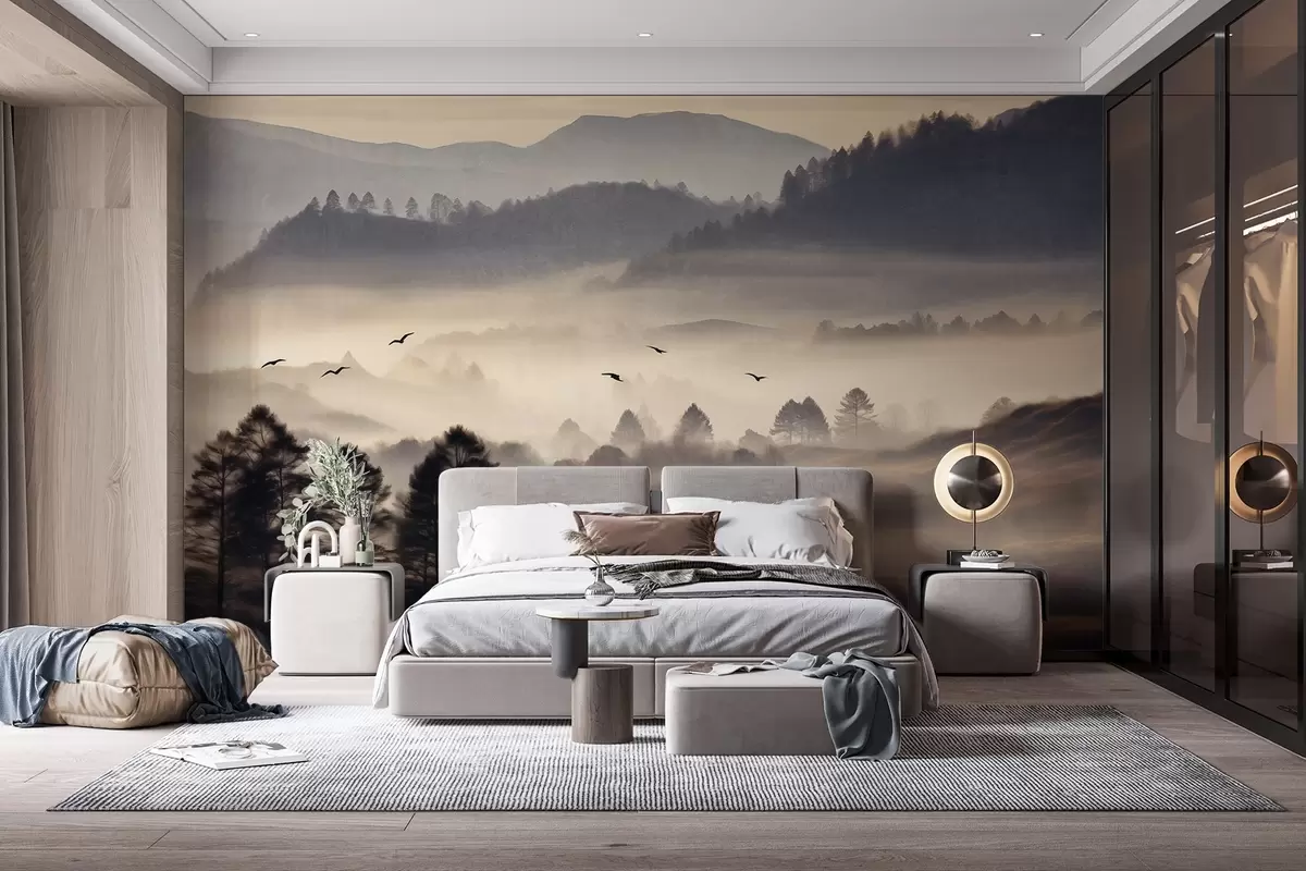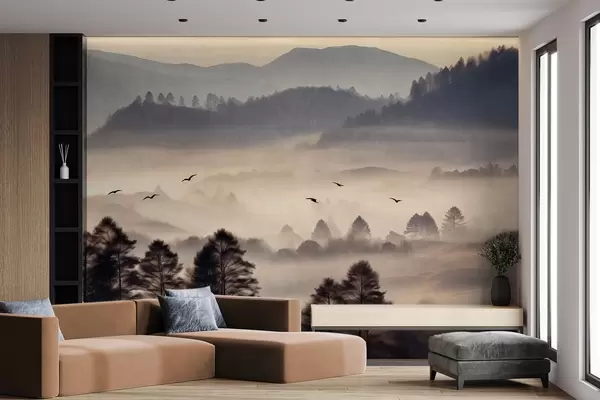 Papel tapiz Paisaje montañoso texturizado con capas de niebla, árboles silueteados en primer plano, cordillera distante, iluminación suave Nr. w09338