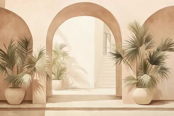 Papel tapiz Arcos texturizados con plantas en macetas, paleta de colores beige claro, diseño minimalista, escalera al fondo Nr. w09339