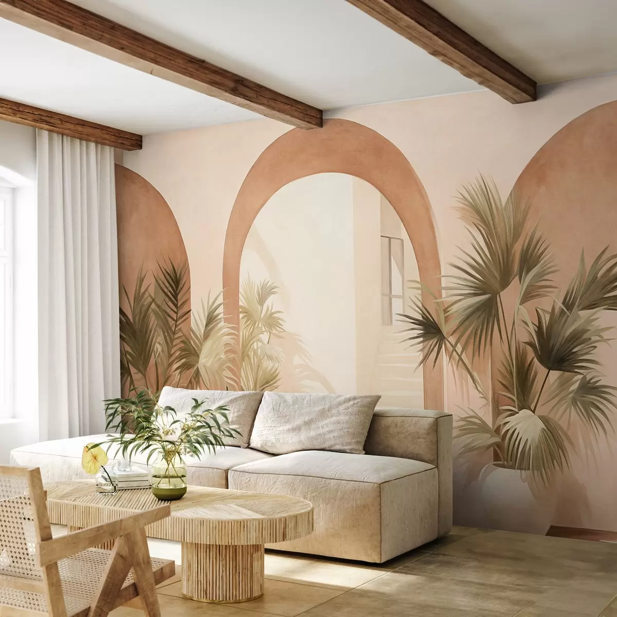Papel tapiz Arcos texturizados con plantas en macetas, paleta de colores beige claro, diseño minimalista, escalera al fondo Nr. w09339
