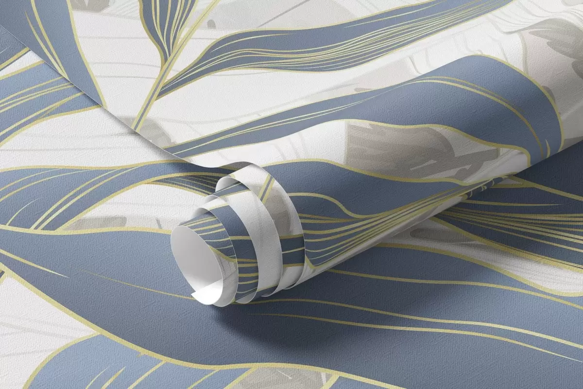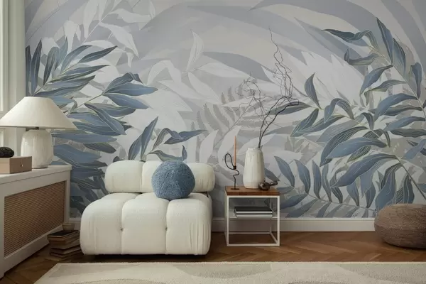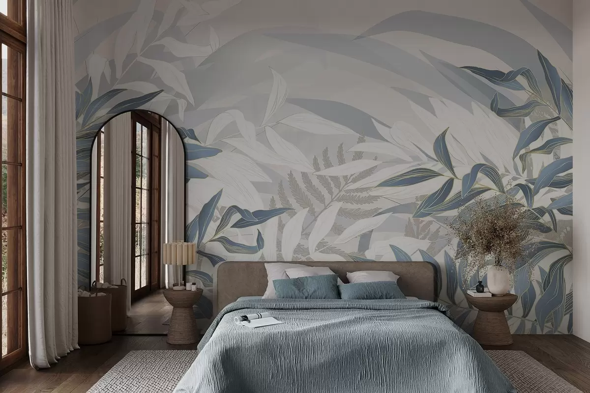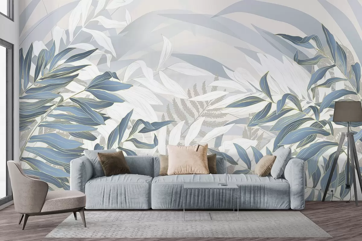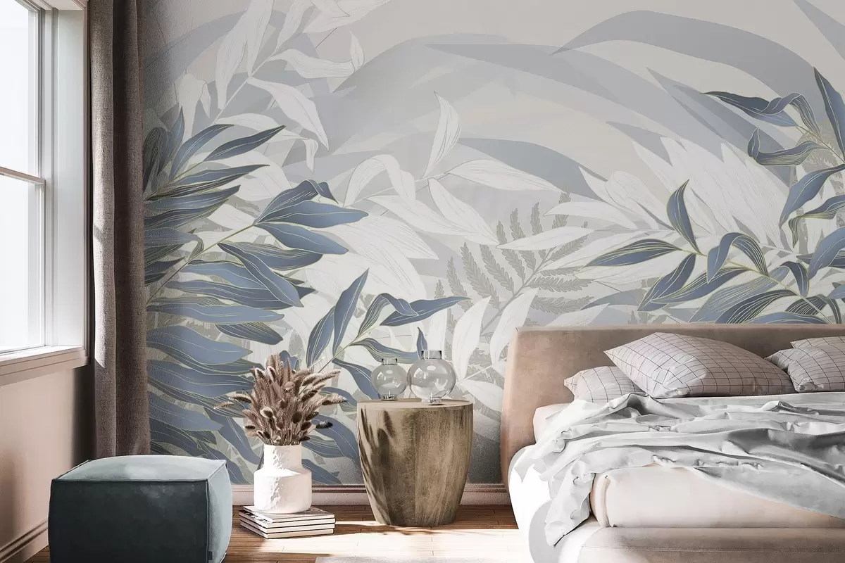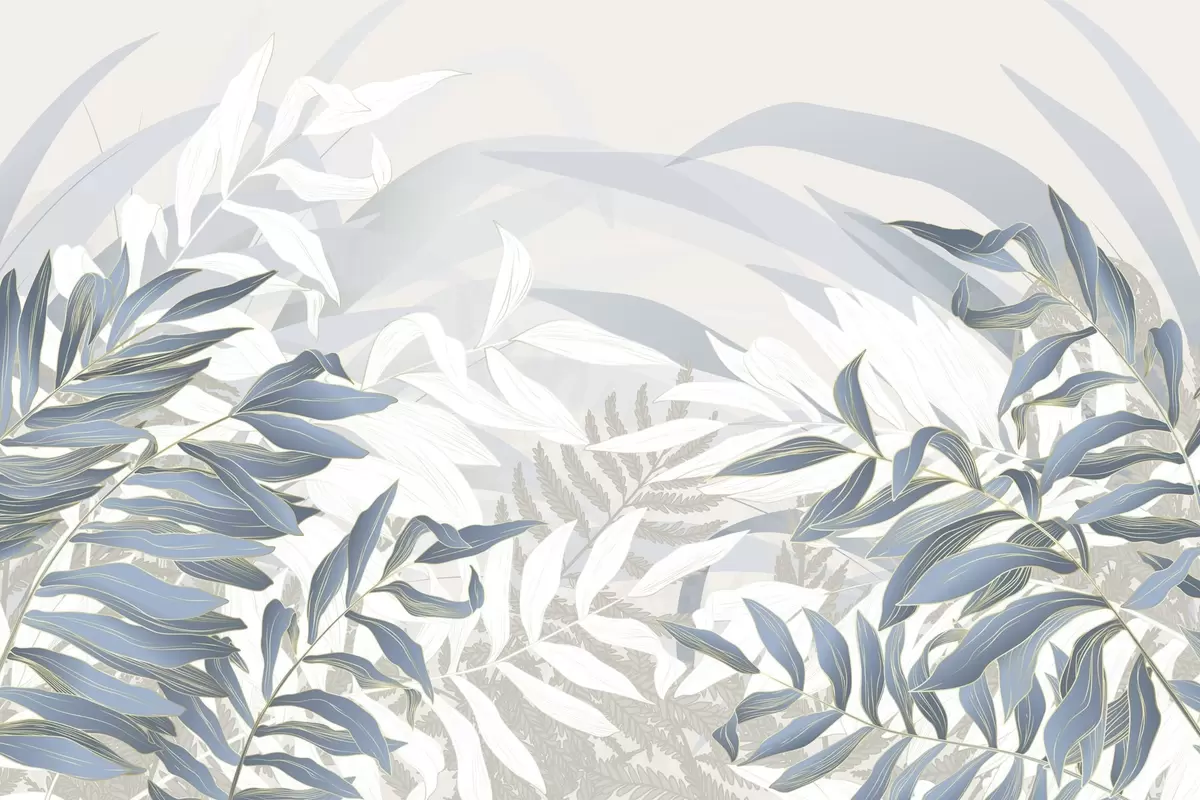 Papel tapiz Hojas y hierba azules y blancas, colores pastel suaves, ilustración botánica, diseño minimalista, decorativo, moderno Nr. w09341
