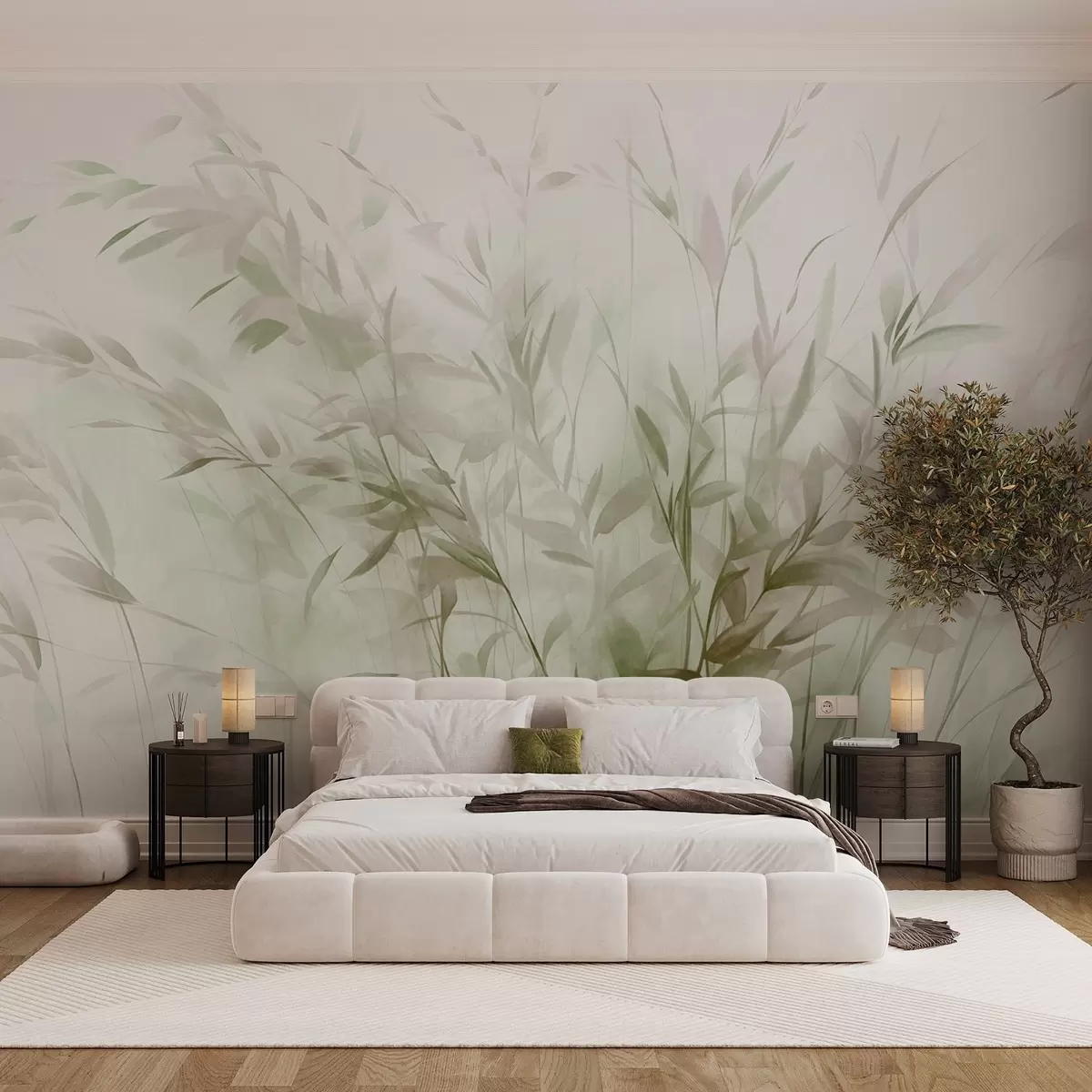 Papel tapiz Hierba y maleza con hojas y tallos finos, colores verde claro y marrón, pinceladas suaves y delicadas, estampado minimalista Nr. w09342