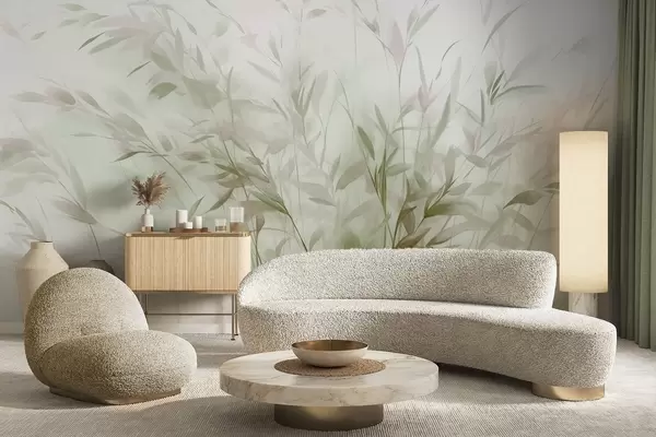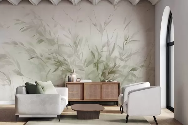 Papel tapiz Hierba y maleza con hojas y tallos finos, colores verde claro y marrón, pinceladas suaves y delicadas, estampado minimalista Nr. w09342