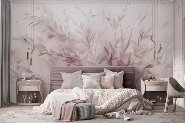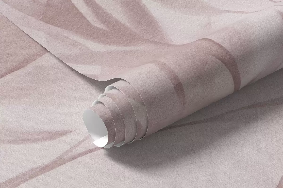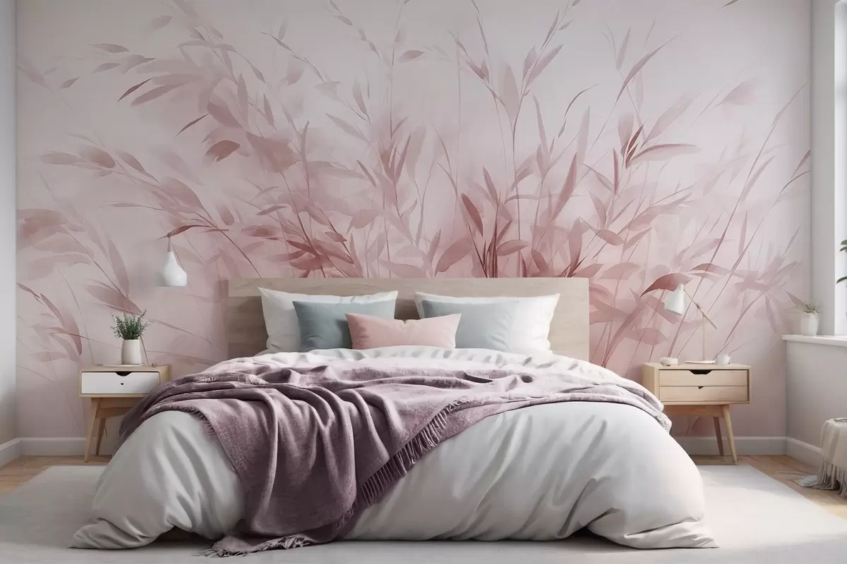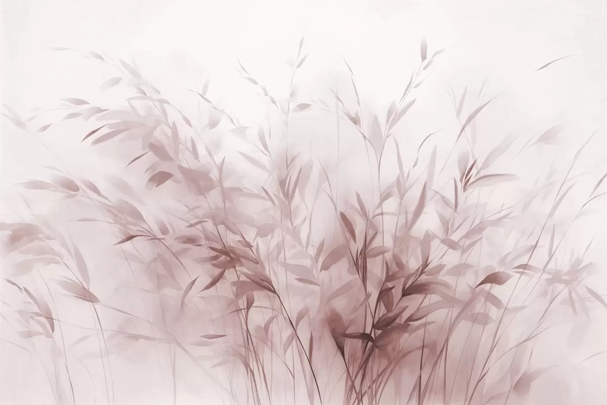 Papel tapiz Hierba y maleza con hojas y tallos finos, colores rosa claro, pinceladas suaves y delicadas, estampado minimalista Nr. w09342v2