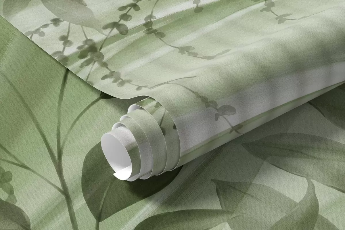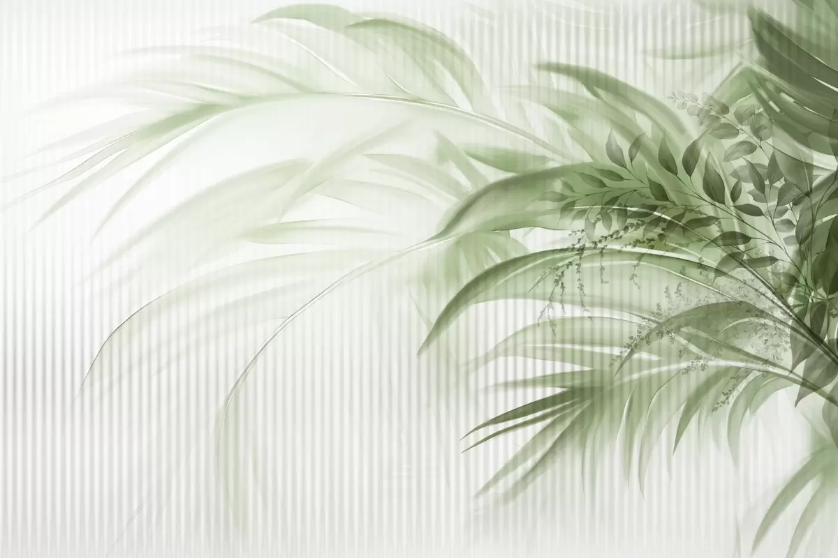 Papel tapiz Palmera tropical de hojas verdes con fondo blanco a rayas, iluminación suave, pinceladas delicadas, formas orgánicas Nr. w09343