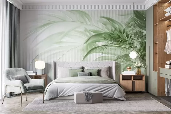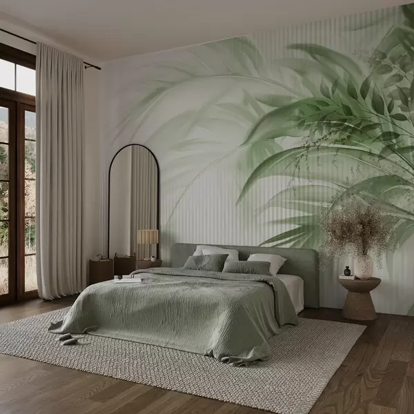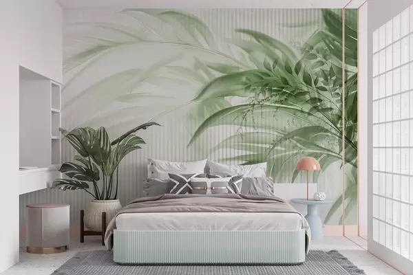 murales de pared Palmera tropical de hojas verdes con fondo blanco a rayas, iluminación suave, pinceladas delicadas, formas orgánicas w09343