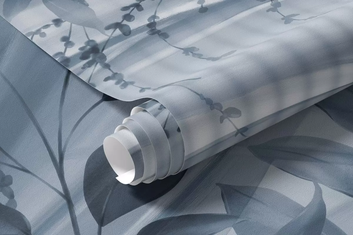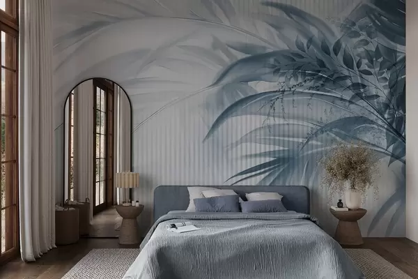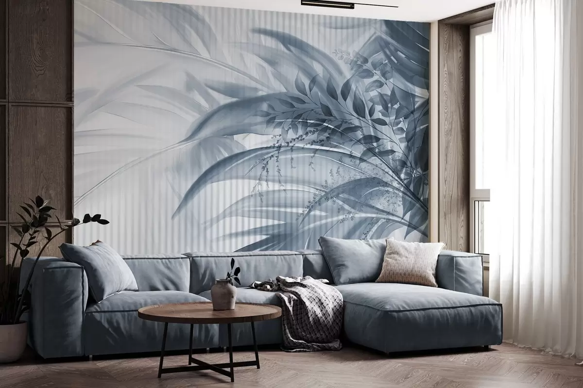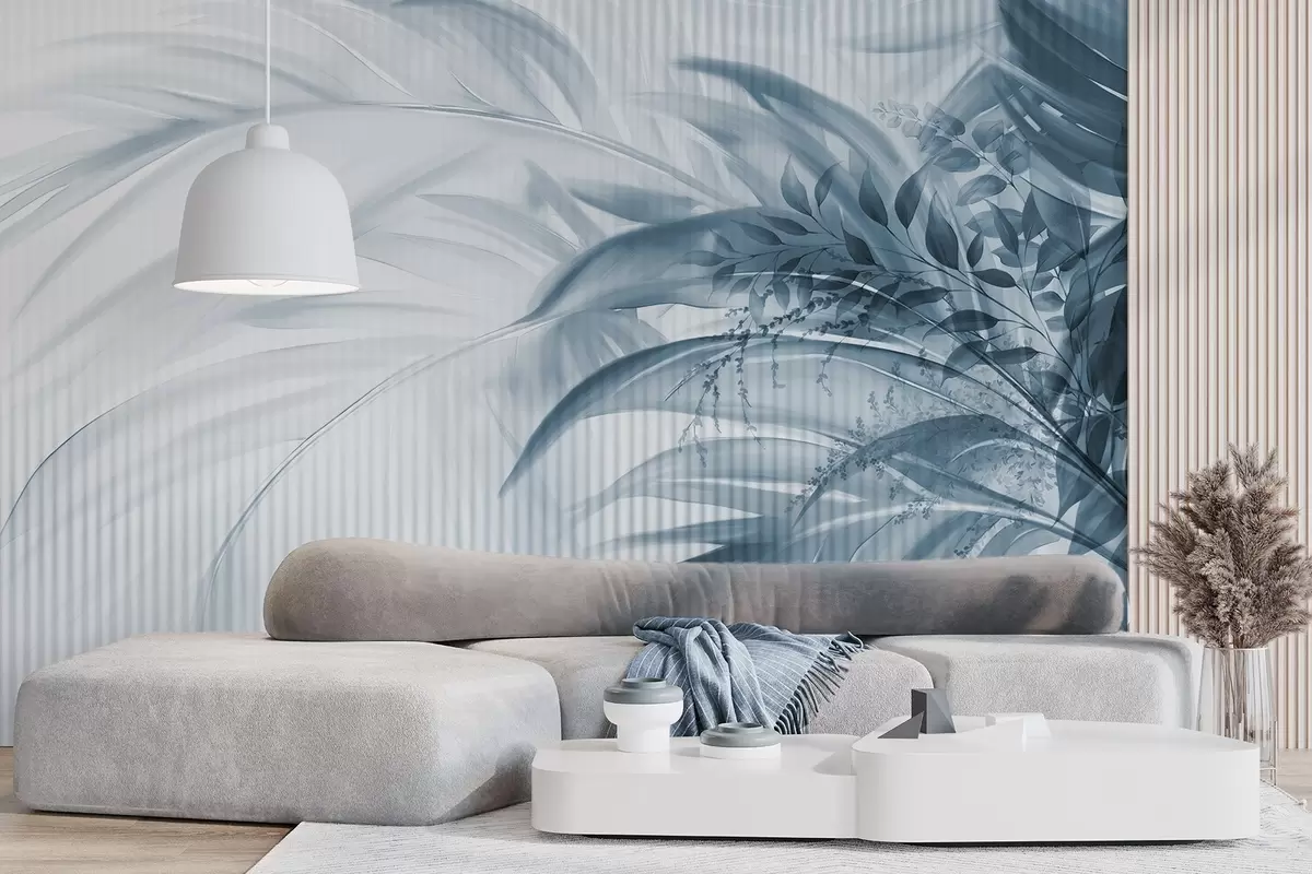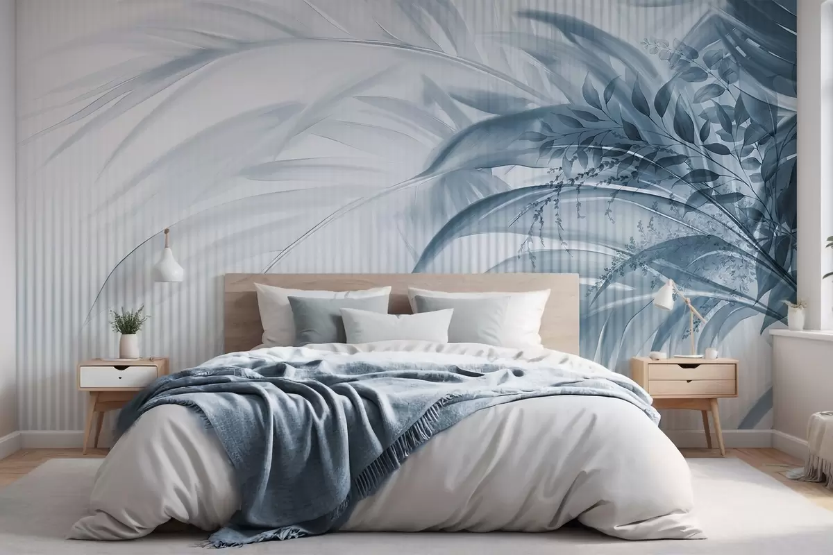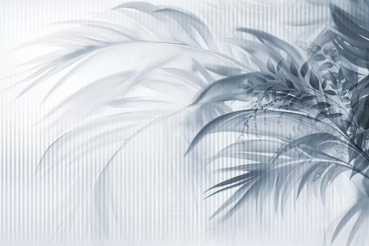 Papel tapiz Palmera tropical de hojas azules con fondo blanco a rayas, iluminación suave, pinceladas delicadas, formas orgánicas Nr. w09343v1
