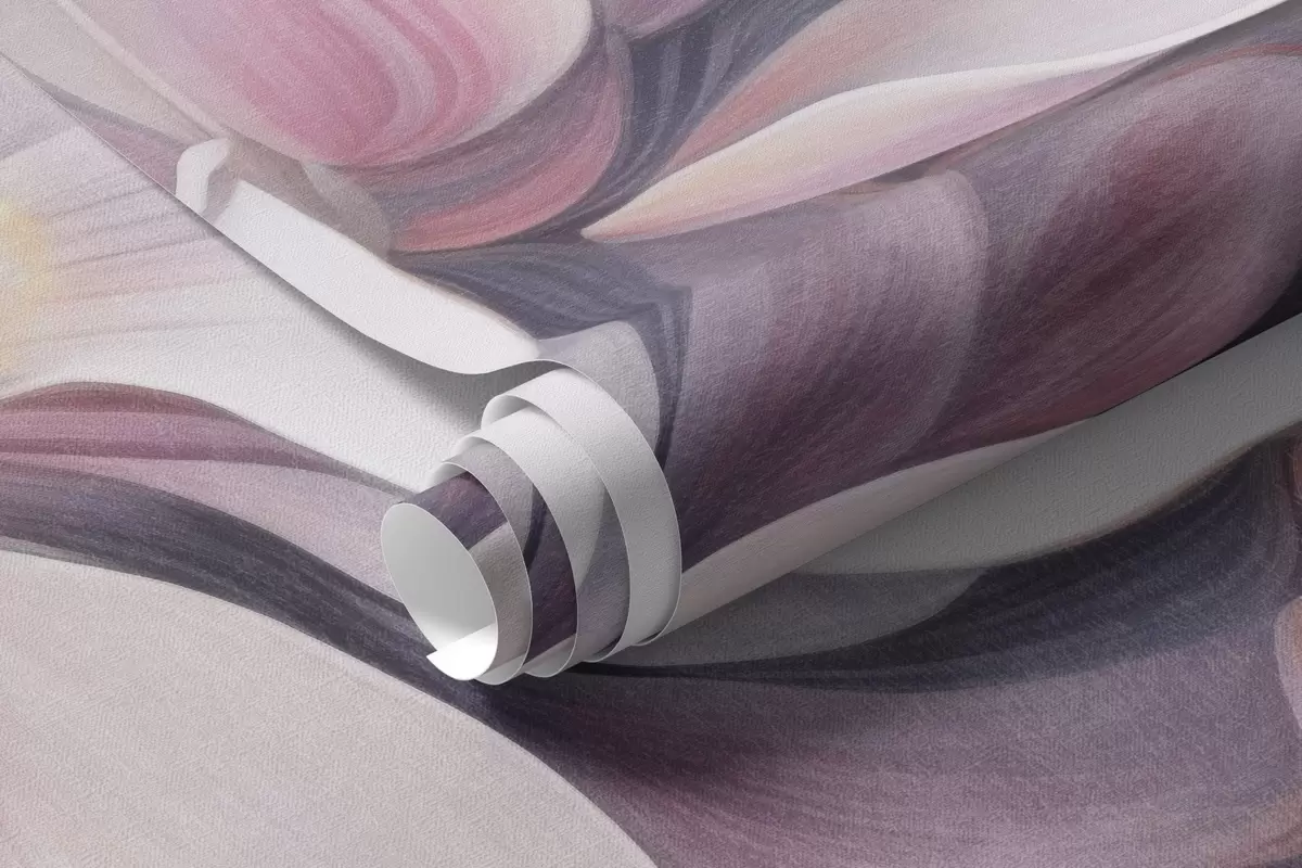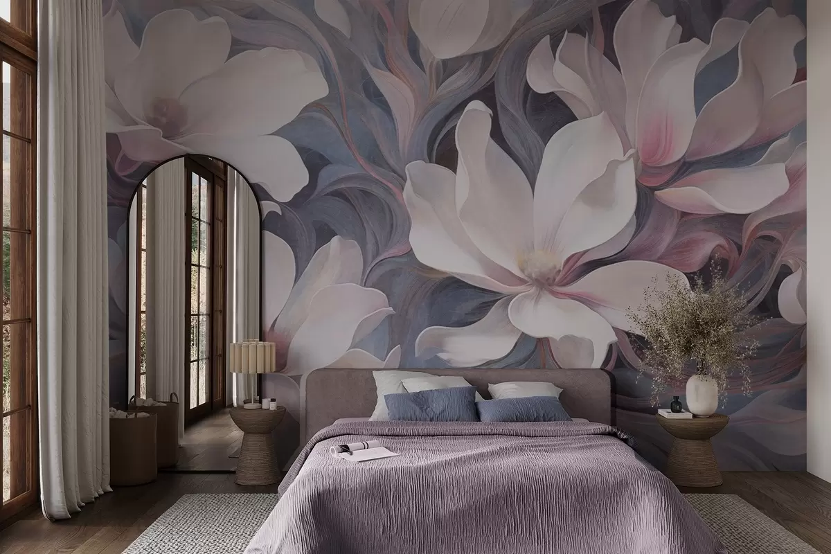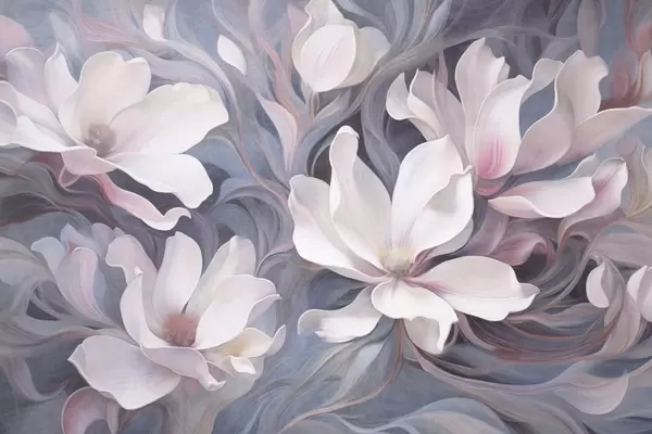 Papel tapiz Pintura texturizada de flores blancas de magnolia con toques rosas, sobre un fondo de tonos azules y grises apagados Nr. w09344