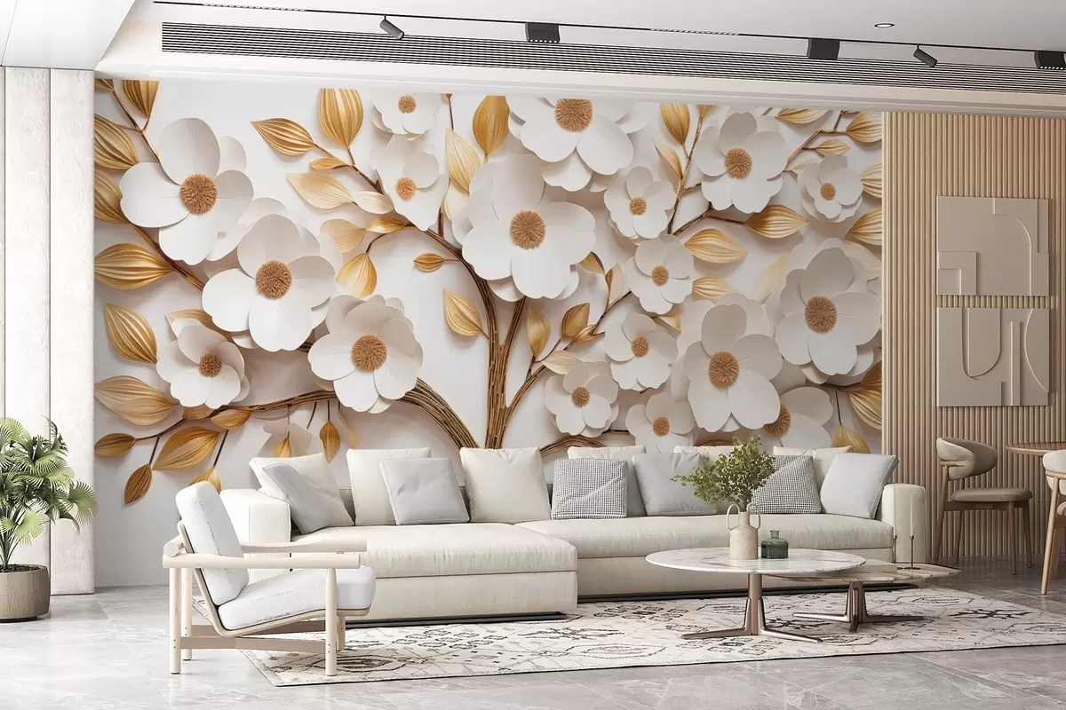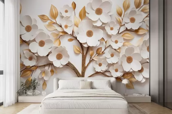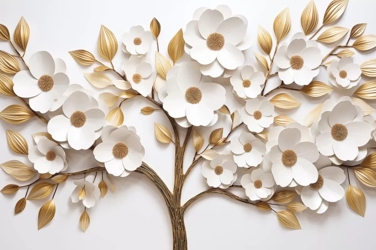 Papel tapiz Árbol con flores blancas e imitación de hojas en relieve Nr. w09348