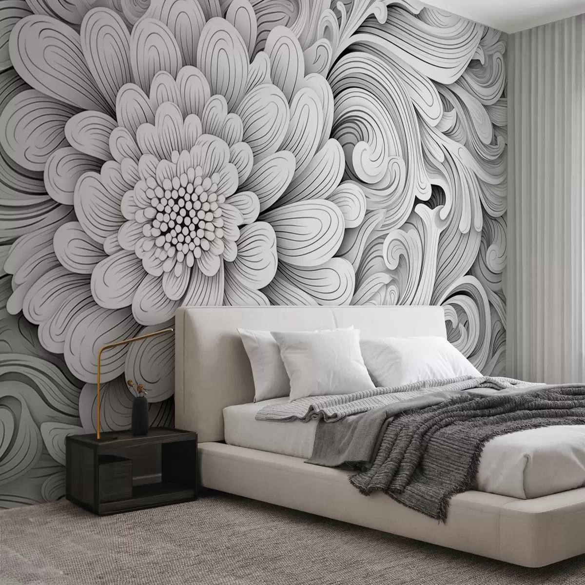 Papel tapiz Motivo decorativo en blanco y negro en forma de flor y remolinos Nr. w09355